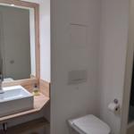 Das puristische Badezimmer mit weißen Wandfliesen ist innen liegend und bietet neben der Dusche einen Waschtisch mit Unterkommode und großer Spiegelfläche sowie zahlreiche Haken für Handtücher.