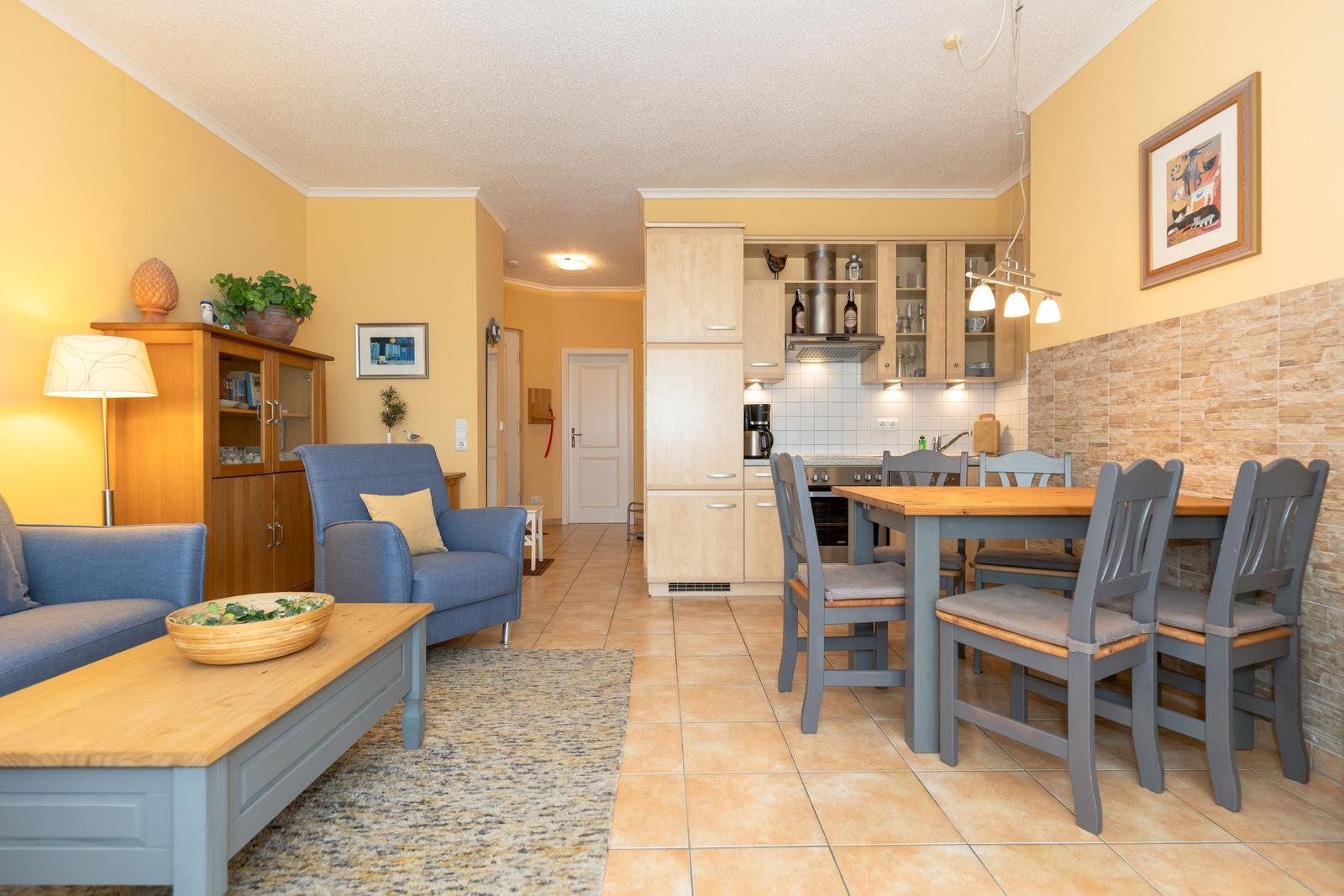 Die komfortable 3-Zimmer-Wohnung mit 55 m² Wohnfläche für bis zu 5 Personen befindet sich im Erdgeschoss des beliebten Hauses "Atlantik" an der Nordseite mit Blick auf Promenade, Seebrücke und Meer.