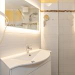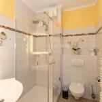 Das Badezimmer verfügt über eine Dusche, ein WC und einen Handtuchheizkörper.