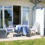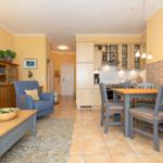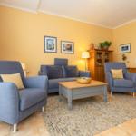 Das großzügige Wohnzimmer ist hell und freundlich eingerichtet mit einem gemütlichen Sofa und zwei Sesseln. Einer der Sessel ist als Ruhesessel waagerecht verstellbar. Ein Flachbildschirm-Gerät sowie Bücher zum Lesen und Gesellschaftsspiele stehen für gemütliche Abende mit der ganzen Familie bereit.