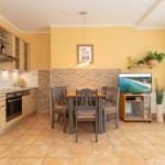 Der Küchen-/Essbereich grenzt an das Wohnzimmer und bietet alles, was Sie für bis zu sechs Personen im Urlaub benötigen. Die Küche ist voll ausgestattet, sie bietet alle Bequemlichkeiten für die Zubereitung Ihrer Mahlzeiten.