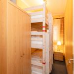 Das zweite Schlafzimmer ist mit einem Dreier-Etagenbett eingerichtet. Sowohl oben als auch unten können auch erwachsene Personen problemlos schlafen, die mittlere Liegefläche ist eher für Kinder gedacht. Auch hier finden Sie einen Kleiderschrank für Ihre Urlaubsgarderobe.