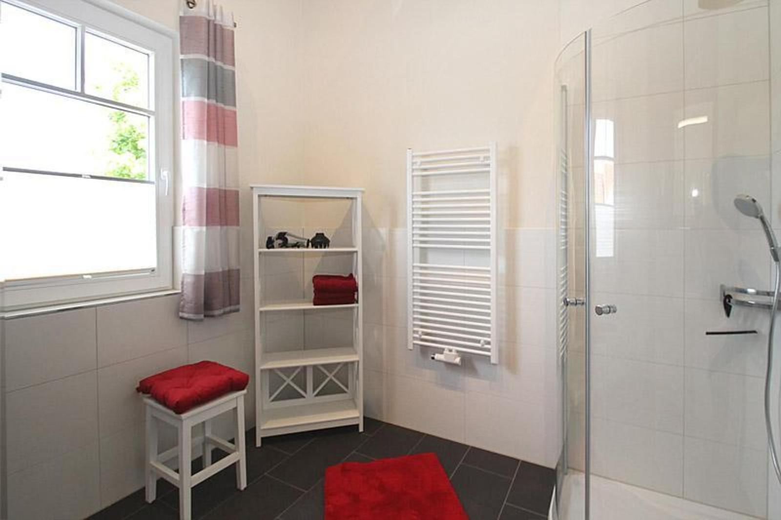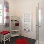 Das helle Tageslichtbad ist ausgestattet mit einer Dusche, einem WC, einem Waschbecken sowie einem Handtuchheizkörper.
