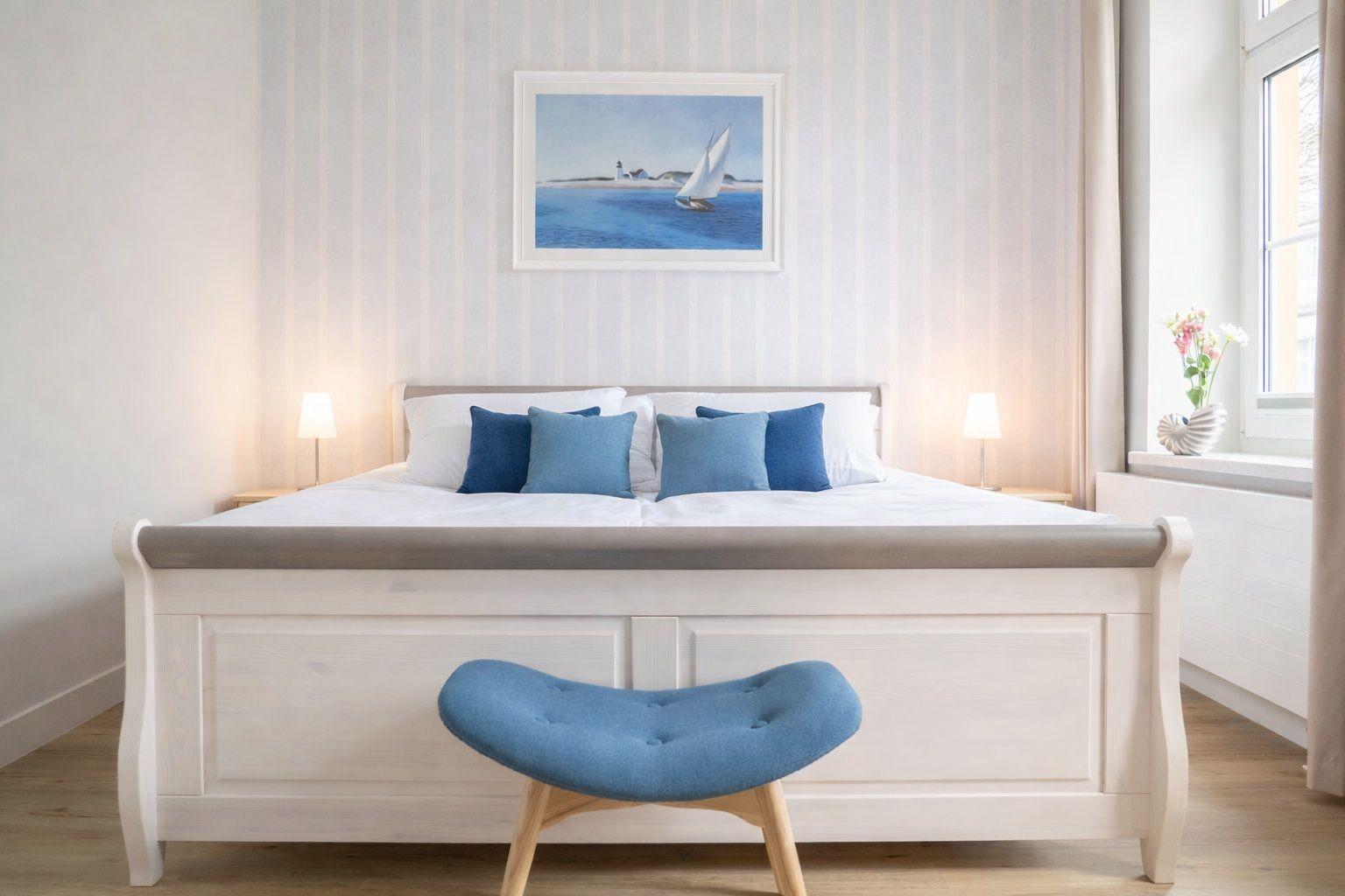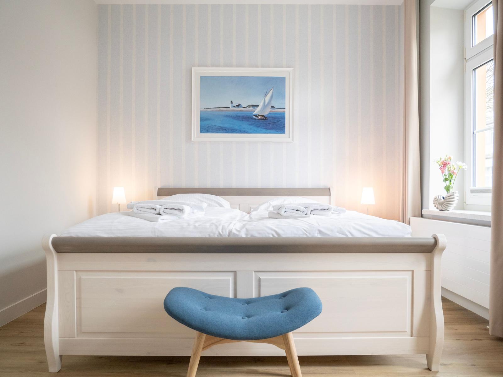 Sie besteht aus einem stilvollem Schlafzimmer mit Doppelbett (180x200cm) und großzügigem Kleiderschrank.