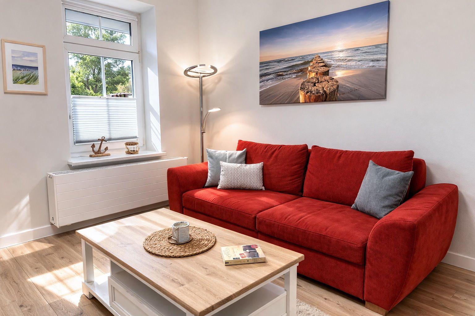 Im geschmackvoll gestaltetem Wohnraum mit bequemer Couch können Sie entspannte Stunden verbringen.