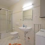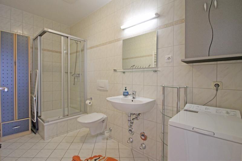 Das Badezimmer ist mit einer Dusche, einem Waschbecken mit großem Spiegel, einem Handtuchheizkörper, Waschmaschine und WC ausgestattet.