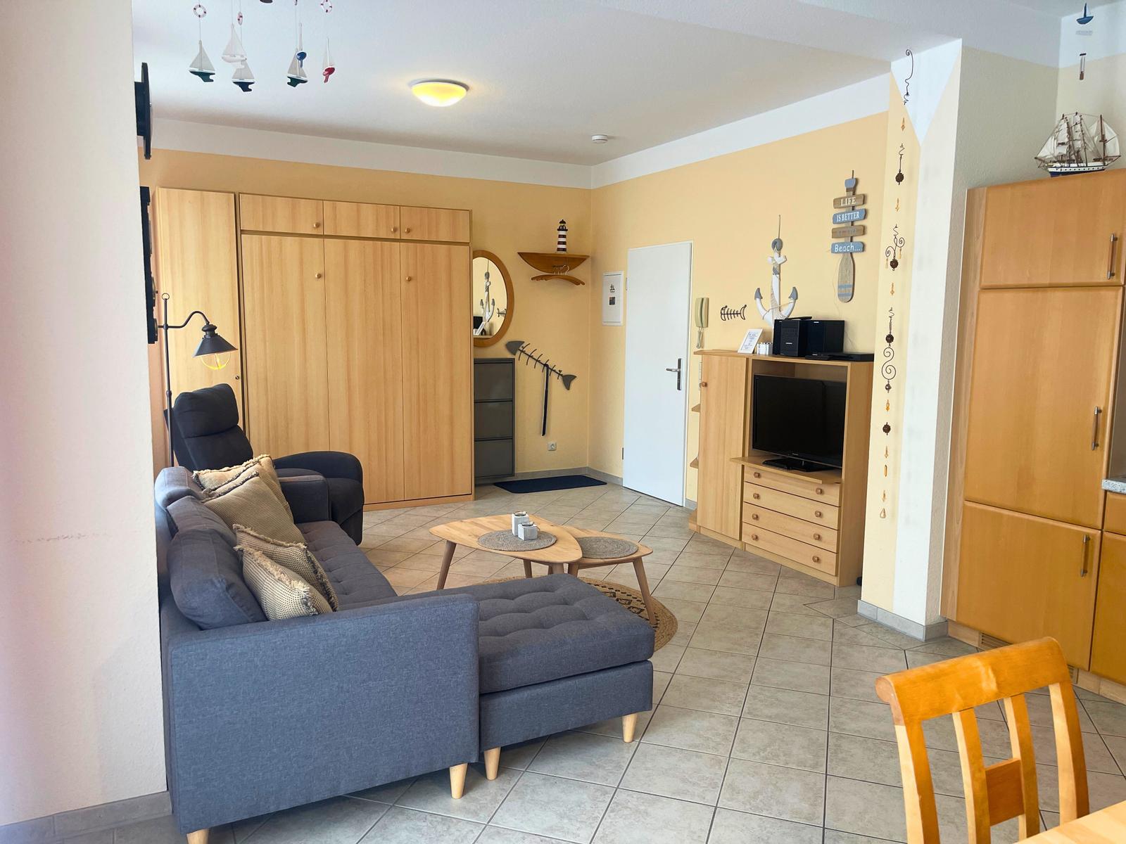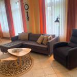 Machen Sie es sich im Wohnbereich in geselliger Runde auf dem Sofa und den beiden Sesseln bequem. Für Ihre Unterhaltung sorgen ein Flatscreen-Fernseher, Blue-Ray Player, HiFi-Anlage sowie diverse Bücher.