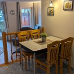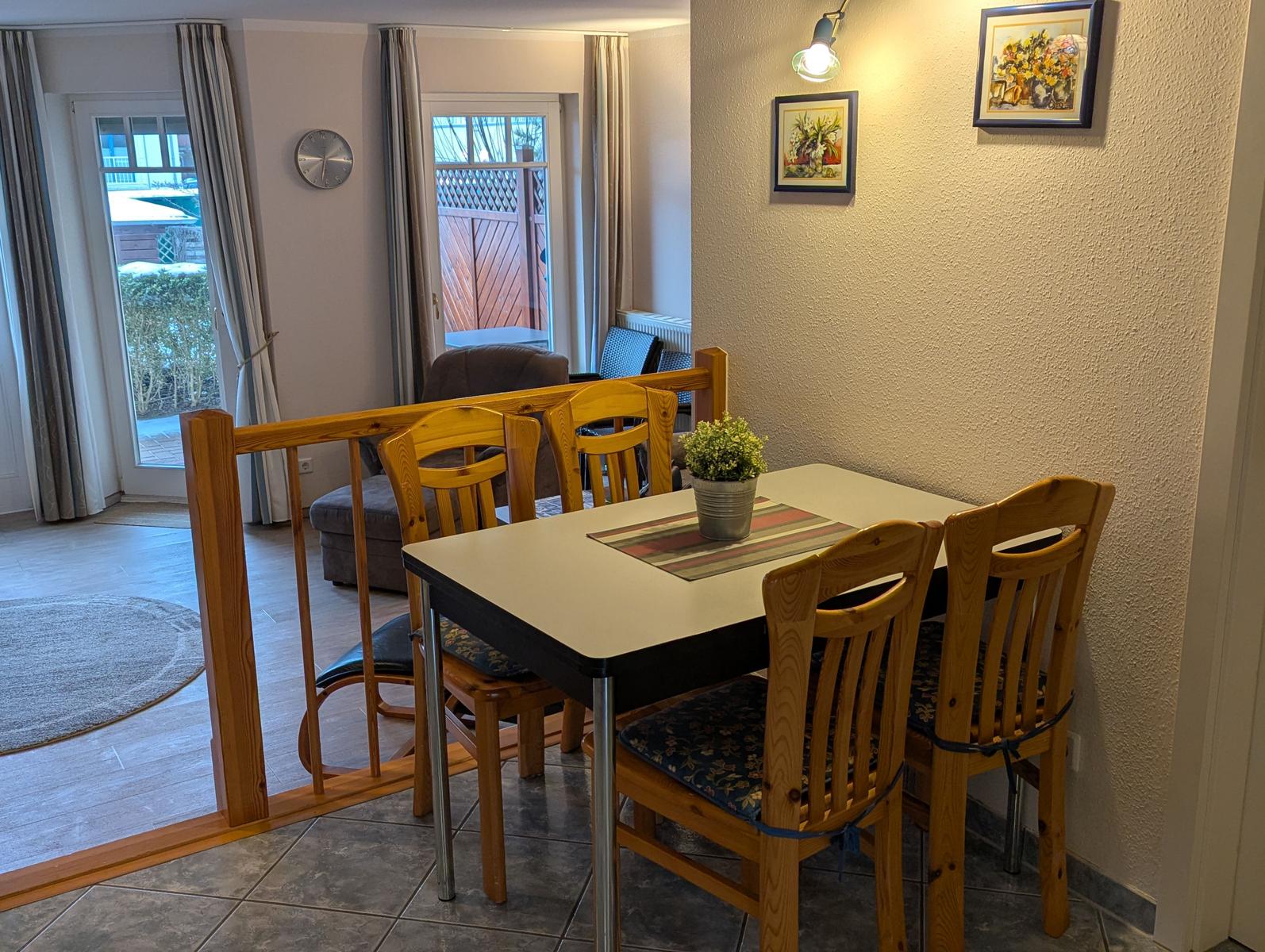 Ein Esstisch für vier Personen grenzt an den Küchenbereich. Nach dem Essen müssen Sie nicht mühsam abwaschen, sondern können ganz einfach den Geschirrspüler nutzen.