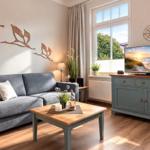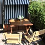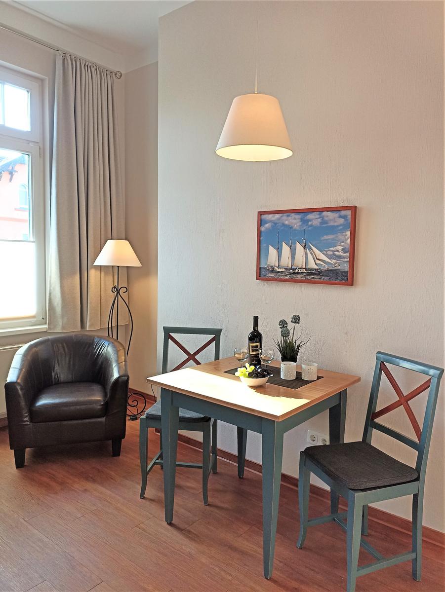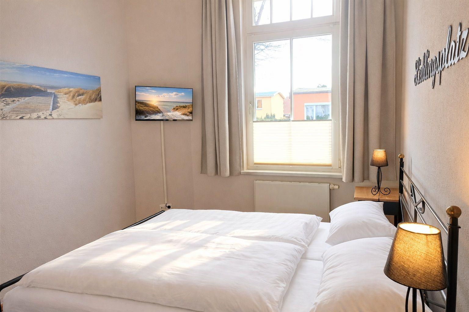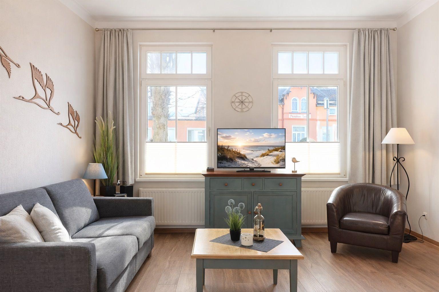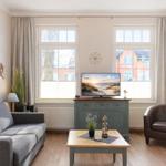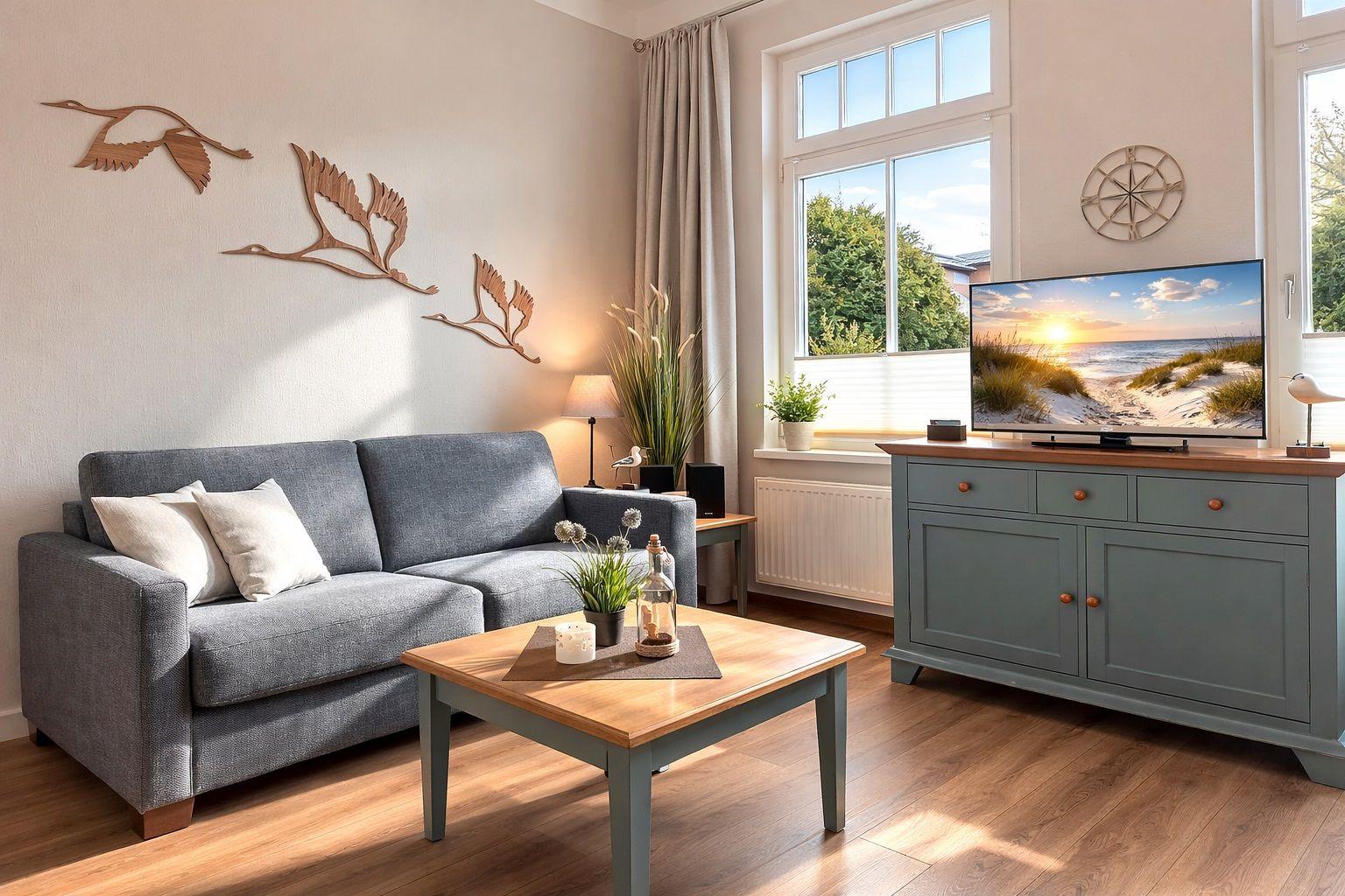 Die Wohnung Lieselotte in der Strandstraße 16 befindet sich im Erdgeschoss mit eigenem Eingang und ist ein freundliches, stilvoll eingerichtetes 2-Zimmer-Appartment mit einer Größe von etwa 41 m². Die Wohnung ist im Schlafzimmer mit einem Doppelbett und im Wohnraum mit einer Doppelschlafcouch ausgestattet und bietet somit bis zu 3 Personen Platz. Die im Wohnraum integrierte Küche ist gut ausgestattet und verfügt unter anderem über 2 Kochfelder, Mikrowelle mit Grill und einen Kühlschrank mit Gefrierfach.