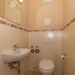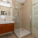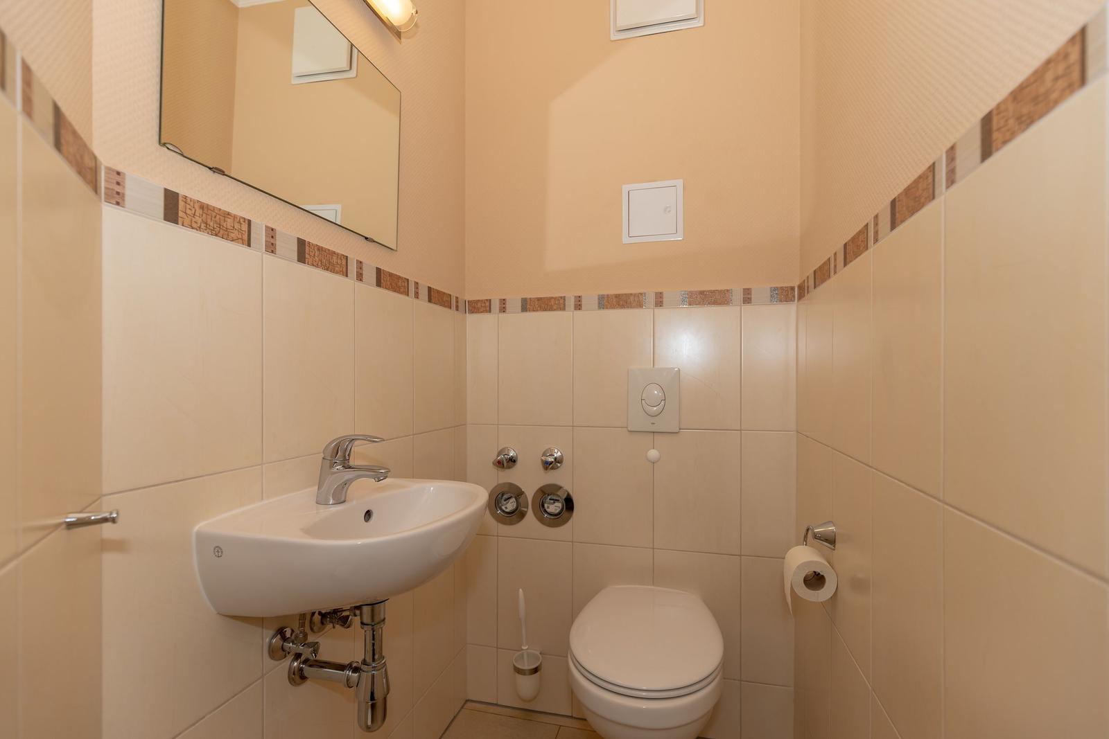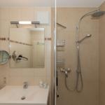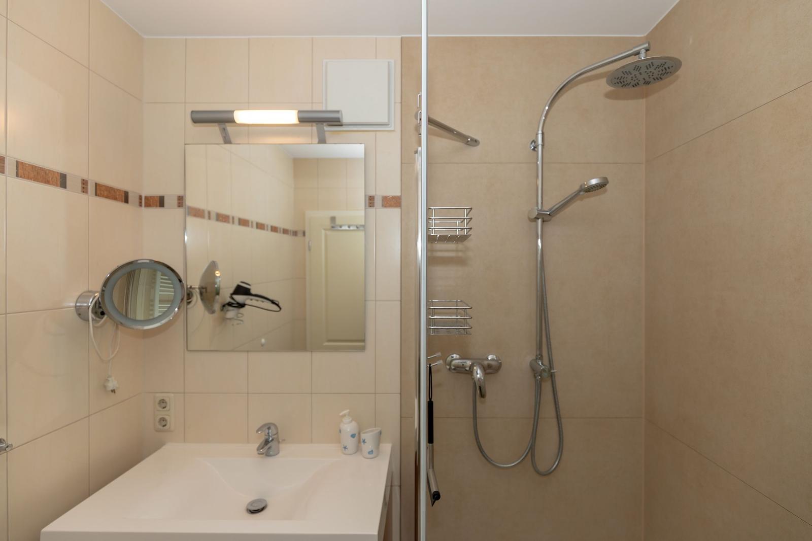 Im stilvoll ausgestatteten Bad können Sie unter der Dusche entspannen. Hier finden Sie einen Fön sowie einen großzügigen Waschtisch. Das gleichermaßen geflieste WC befindet sich separat.