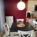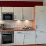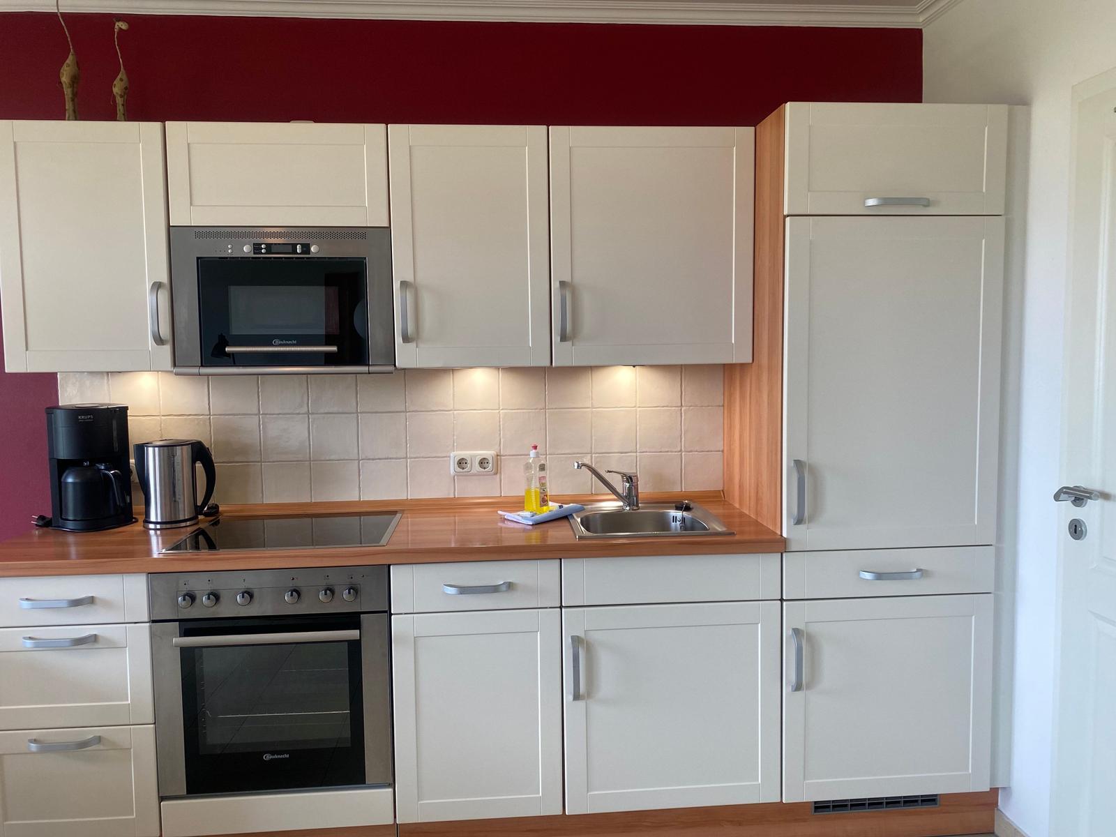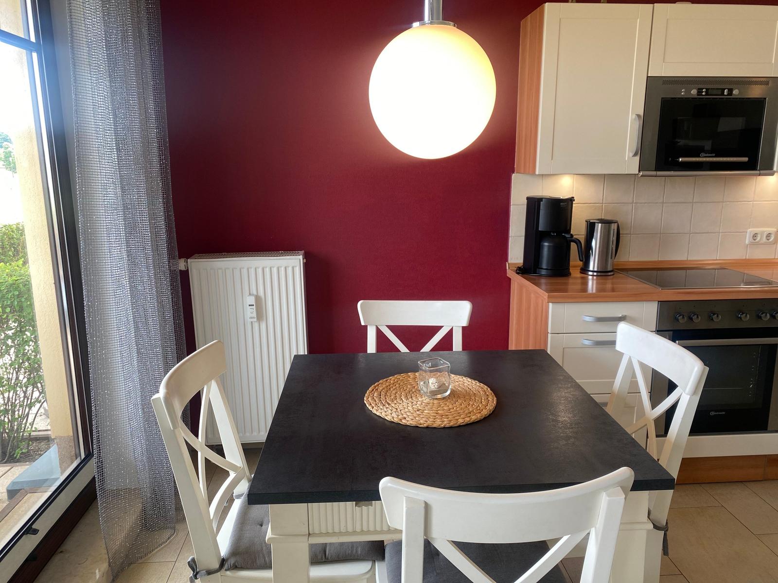 An den Wohnbereich grenzt der Esstisch mit Platz für drei Personen. Genießen Sie ein gemütliches Frühstück mit der ganzen Familie oder am Abend das perfekte Dinner...Die Küche ist mit einem Ceran-Kochfeld, einem Backofen, einem Geschirrspüler, einer Mikrowelle und einem Kühlschrank mit Gefrierfach ausgestattet. Des Weiteren gehören eine Kaffeemaschine, ein Wasserkocher und ein Toaster zum Inventar. Selbstverständlich finden Sie auch ausreichend Geschirr, Besteck und weitere Küchenutensilien.