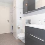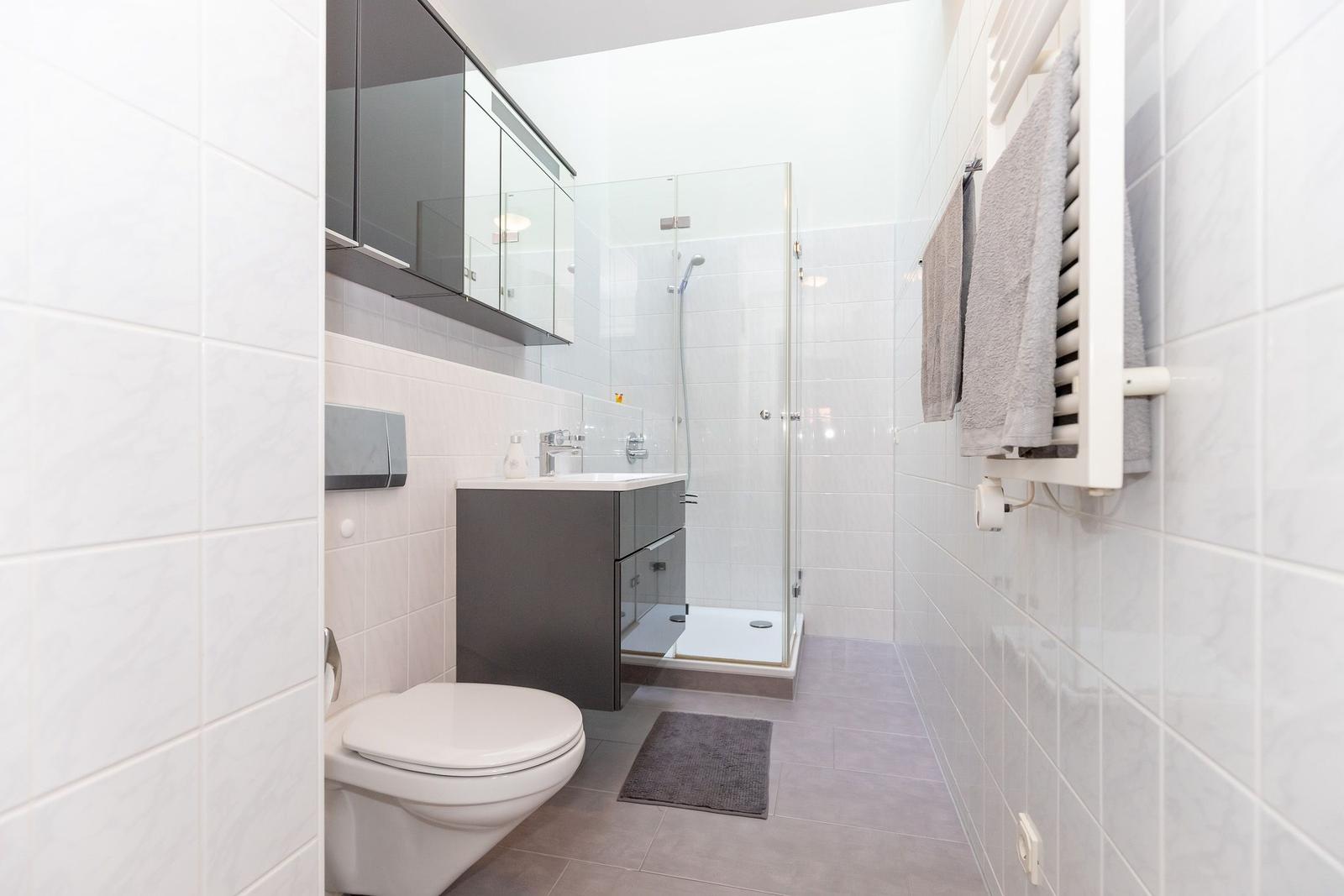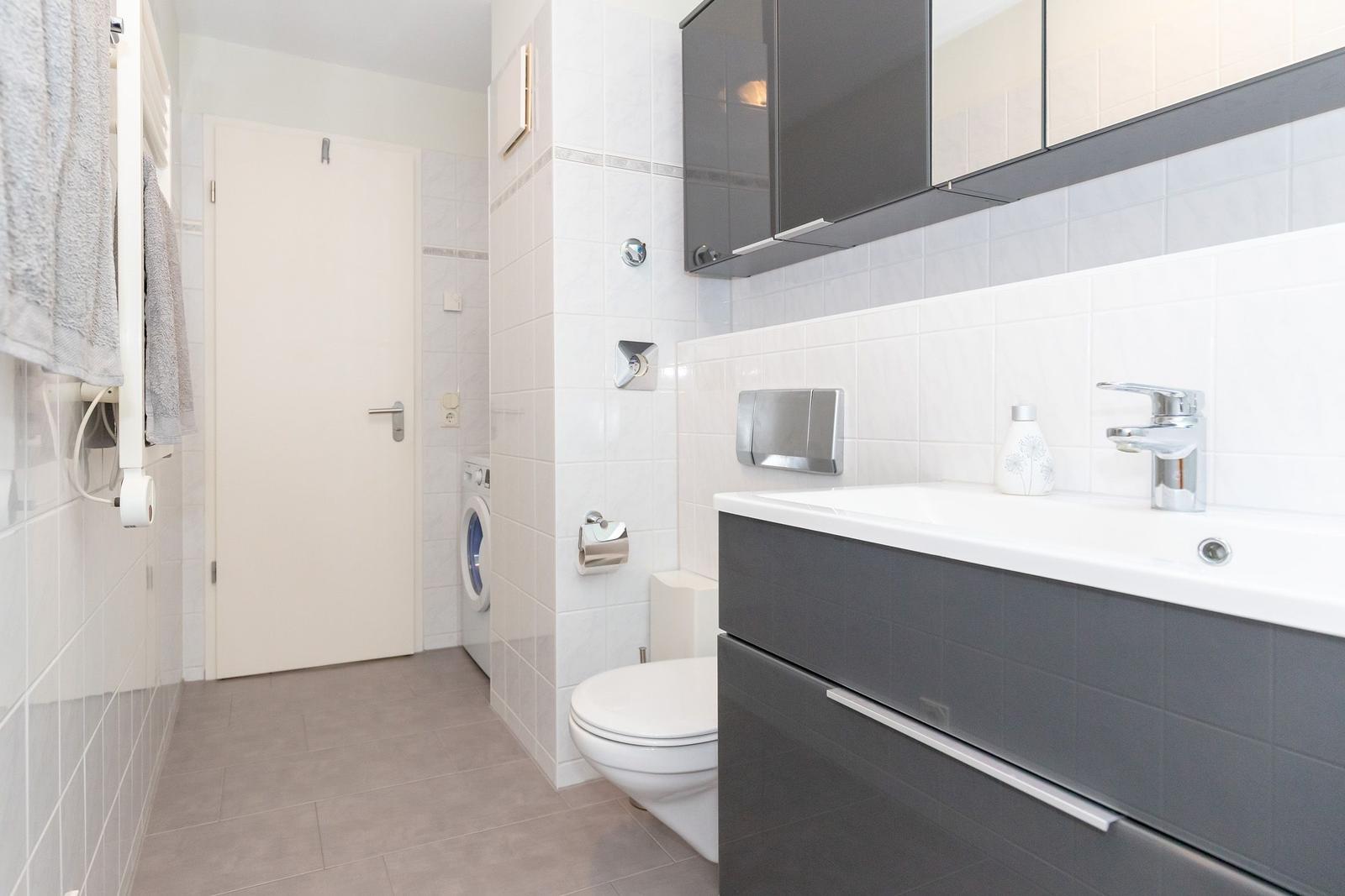 Das helle Tageslichtbad verfügt über eine Dusche mit niedrigem Einstieg sowie einem modernen Waschtisch, für längere Aufenthalte steht Ihnen hier außerdem eine praktische Waschmaschine zur Verfügung!