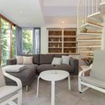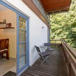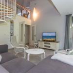 Im geschmackvoll eingerichteten Wohnzimmer können Sie einen gemütlichen Abend bei Gesellschaftsspielen oder einer lustigen Erzählrunde verbringen. Ein moderner Flatscreen-TV steht für Ihr Entertainment zur Verfügung. An den Wohnbereich schließt sich einer der insgesamt 3 Balkone mit kleinem Tisch sowie dazugehörigen Sitzgelegenheiten an.