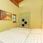 Das erste, mit weichem Teppichboden ausgelegte Schlafzimmer im 1. Geschoss der Wohnung verfügt über ein komfortables Doppelbett mit 2 getrennten Matratzen und genügend Stauraum für Ihre Urlaubsgarderobe.