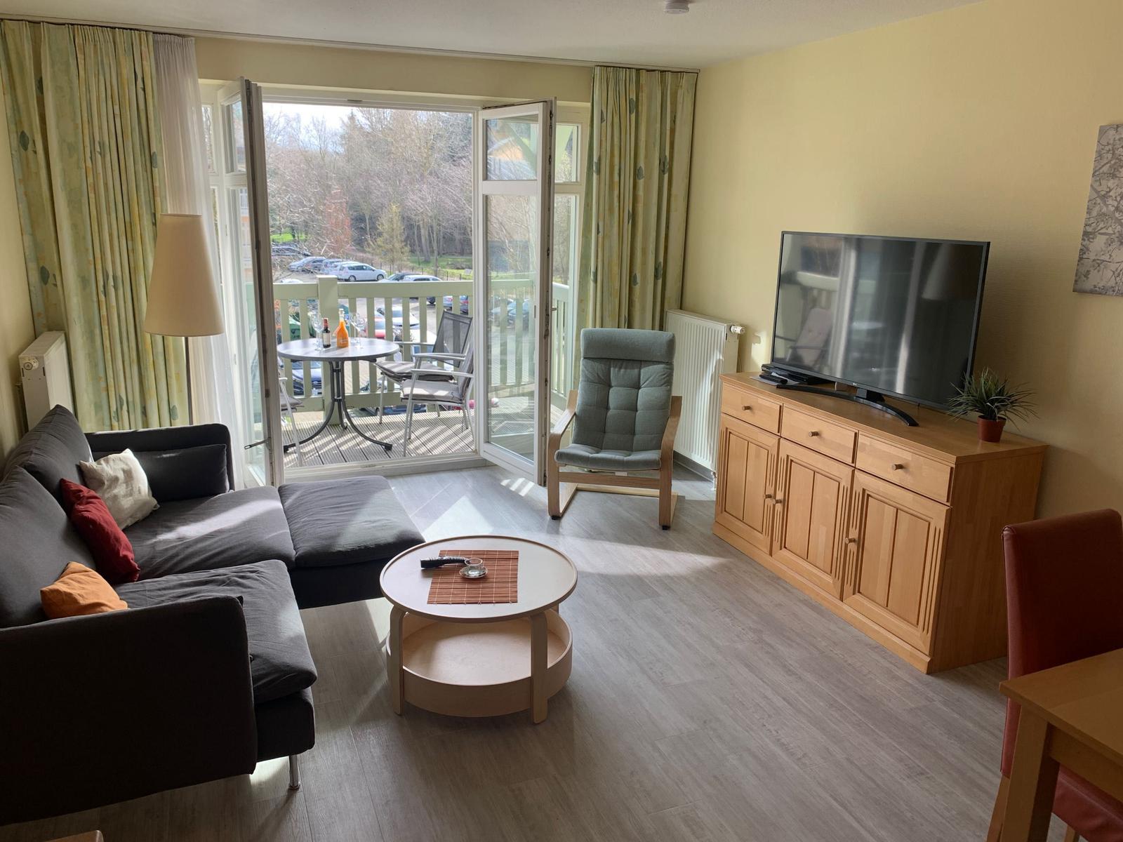 Das 2-Zimmer-Apartment mit Holzoptik-Bodenbelag befindet sich in der 2.Etage mit Aufzug im Apartmenthaus Waldeck. Mit rund 50 m² Wohnfläche und einem Balkon mit seitlichem Seeblick. Das geräumige Apartment besteht aus einem Wohnzimmer und einer voll ausgestatteten Küchenzeile mit Geschirrspülmaschine, Kühlschrank, Mikrowelle, Zwei-Platten-Cerankochfeld, Kapsel-Kaffeautomat sowie eine normale Kaffeemaschine, einem Wasserkocher und einem Toaster.