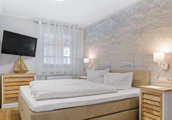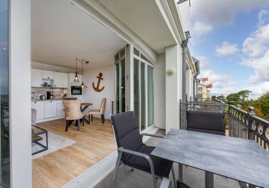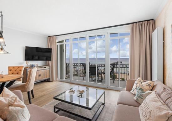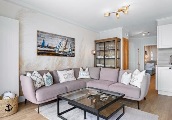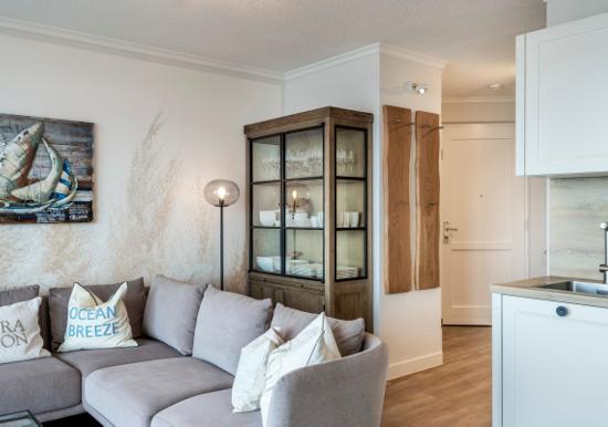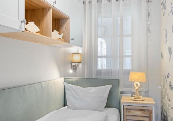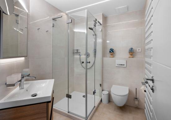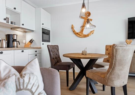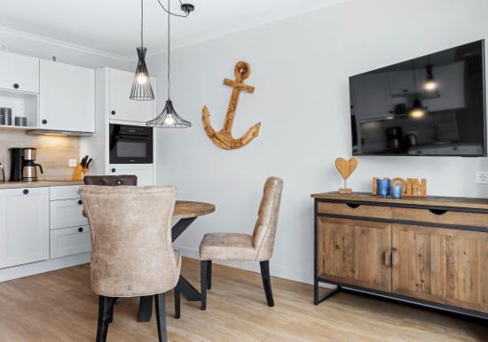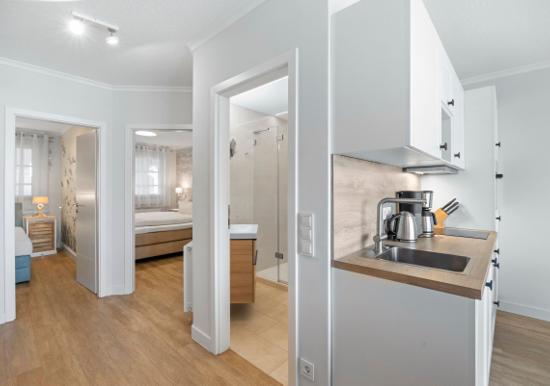 Diese Ferienwohnung bietet eine moderne und komfortable Ausstattung, ideal für einen erholsamen Aufenthalt. Sie verfügt über zwei Schlafzimmer, darunter ein Schlafzimmer mit einem Doppelbett (1,80 m x 2 m) und ein weiteres mit einem Einzelbett (0,90 m x 2 m). Der helle Wohnbereich lädt mit einem Sofa und einem Sessel zum Entspannen ein. Die offene Küche ist mit allem ausgestattet, was für die Selbstversorgung benötigt wird: Geschirrspüler, Elektro-/Gasherd, Backofen, Mikrowelle, Kühlschrank mit Gefriermöglichkeit, Kaffeemaschine, Wasserkocher und Toaster. Das Badezimmer bietet eine Dusche, Haartrockner und Kosmetikspiegel. Die Wohnung ist allergikergeeignet und verfügt über WLAN, TV sowie Rauchmelder. Ein Parkplatz und ein Fahrstuhl sind ebenfalls vorhanden. Geschirr, Besteck, Bügeleisen, Staubsauger und ein Wäscheständer runden das Angebot ab. Ein sonniger Esstisch sorgt für gesellige Mahlzeiten.
