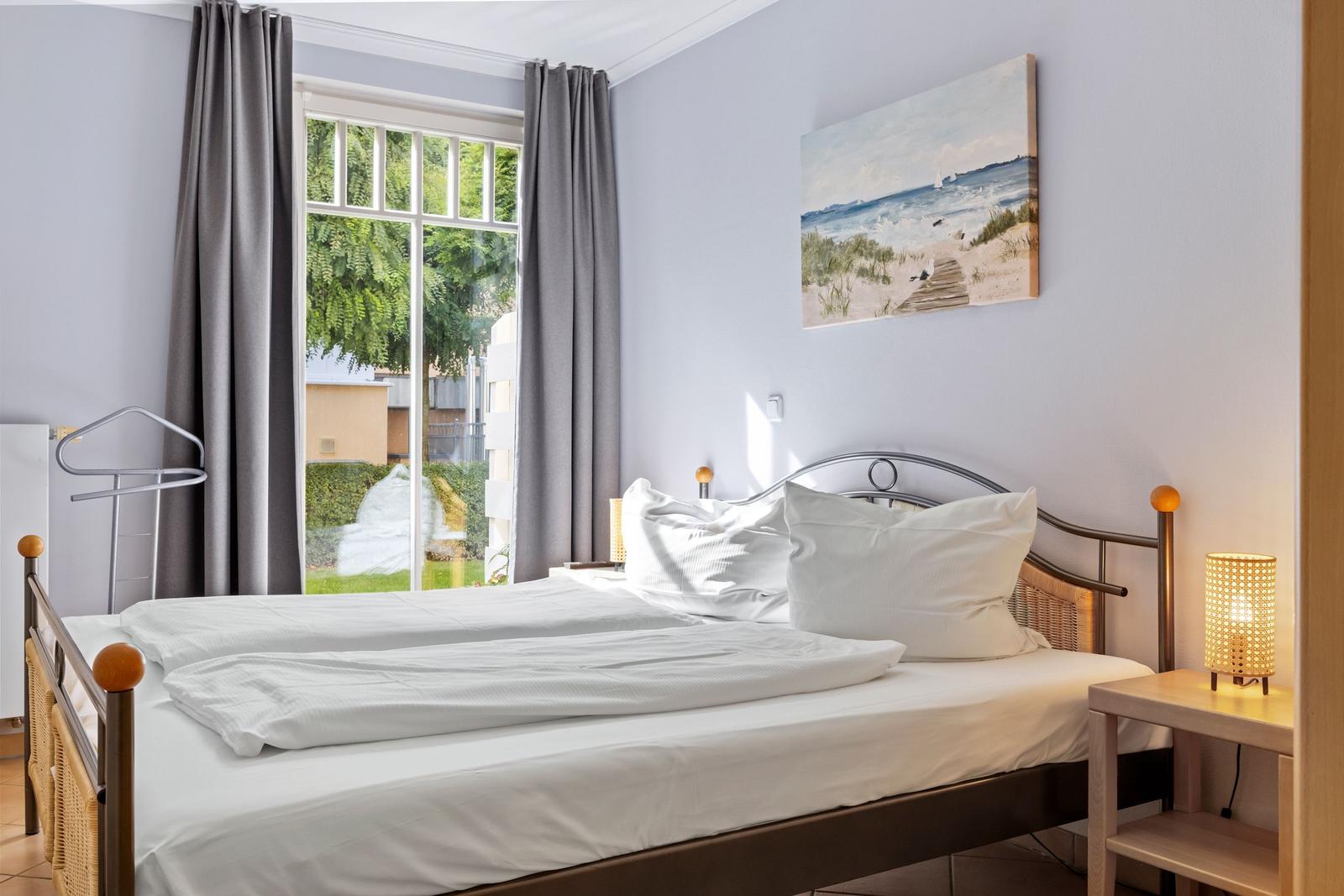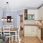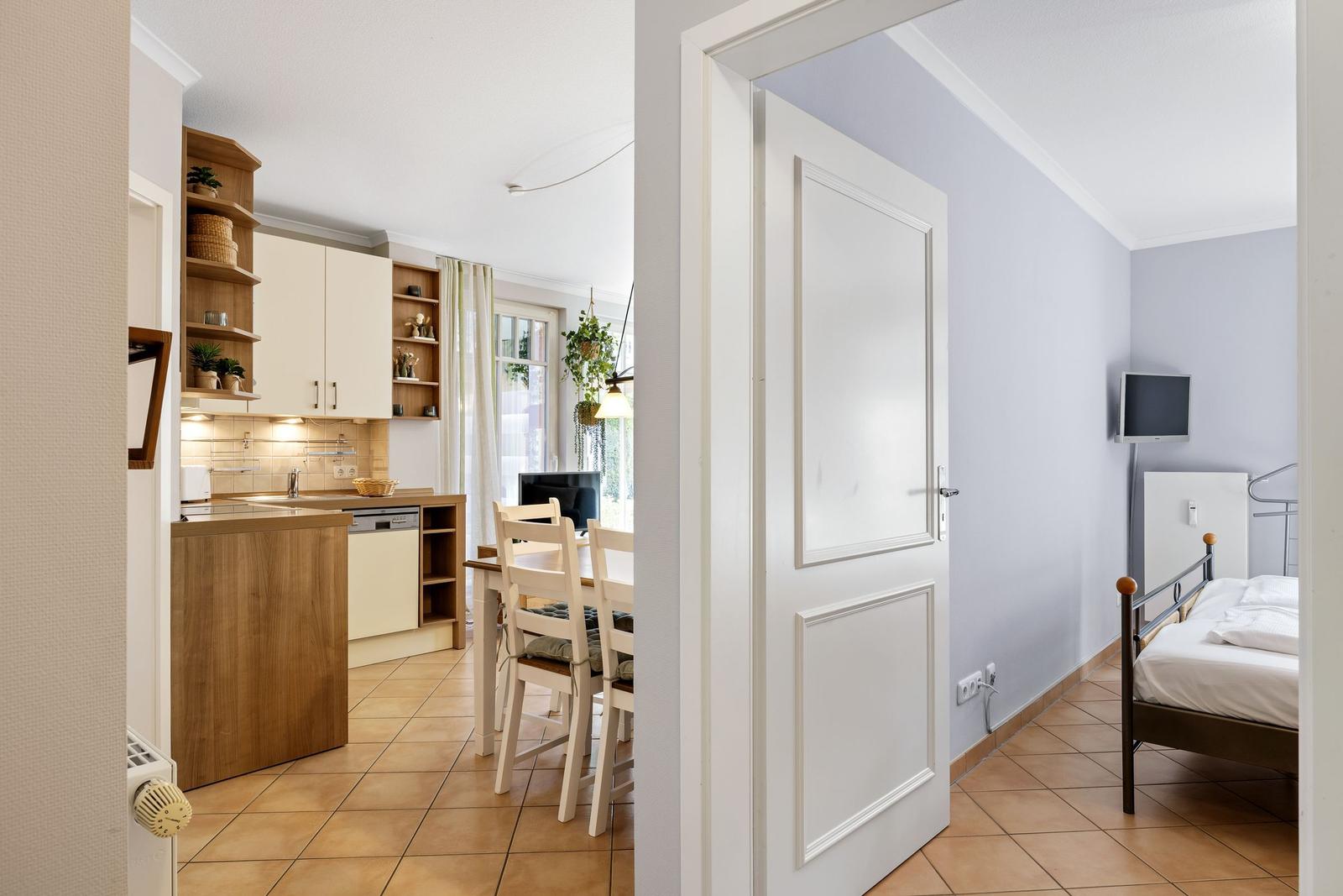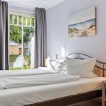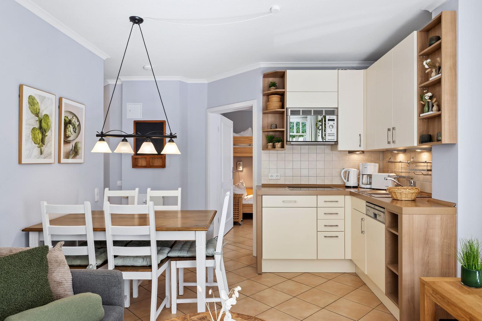 Die Ferienwohnung überzeugt durch großzügige und barrierefreie Räume, die sowohl Komfort als auch moderne Ausstattung bieten. Die offene Küche ist mit einem Geschirrspüler, einem Elektro-/Gasherd, einer Mikrowelle, einem Kühlschrank, einer Kaffeemaschine, einem Toaster, einem Wasserkocher sowie einem Mixer vollständig ausgestattet. Im Wohnbereich befindet sich eine Schlafcouch, die zusätzlichen Platz bietet, und ein Essbereich lädt zum Verweilen ein. Die beiden Schlafzimmer sind mit einem Doppelbett sowie zwei Einzelbetten ausgestattet und bieten Ruhe und Erholung. Das Duschbad punktet mit einer bodengleichen Dusche, einem Haartrockner und einem Kosmetikspiegel. Zur Unterhaltung stehen eine HiFi-Anlage, ein TV sowie ein DVD-/Blu-Ray-Player zur Verfügung. Ein Parkplatz und ein Fahrstuhl erleichtern den Zugang. Die Wohnung ist allergikergeeignet und mit modernen Annehmlichkeiten, wie Rauchmeldern und Staubsauger, ausgestattet. Ein Sonnenschirm steht ebenfalls bereit.