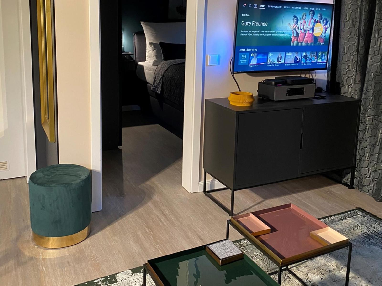 Besondere Highlights sind die Ambilight Funktionen der beiden Flachbildschirme, das funktionale Dieter Knoll Sofa sowie das große Boxspringbett von Ruf im separaten Schlafzimmer.