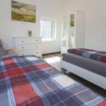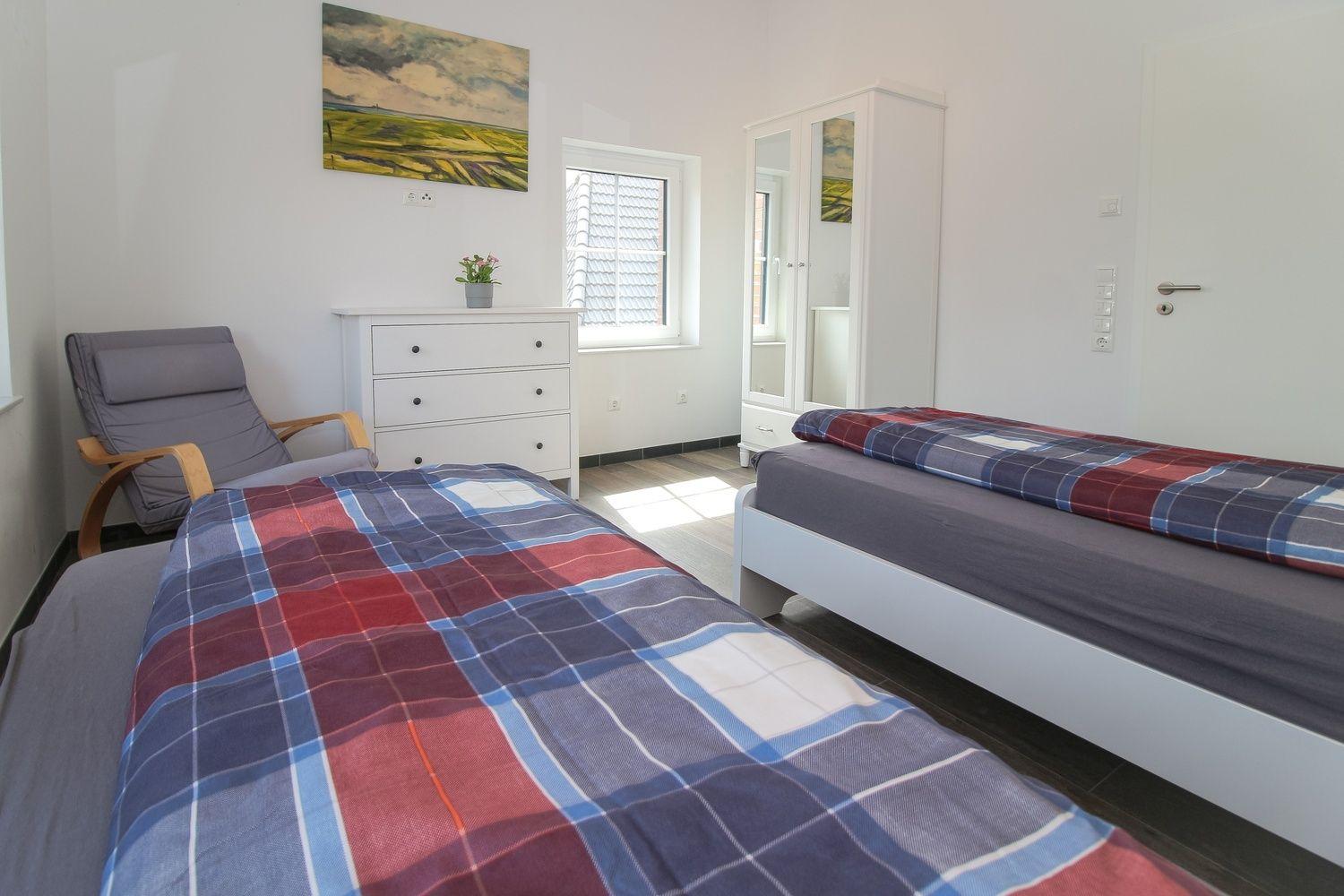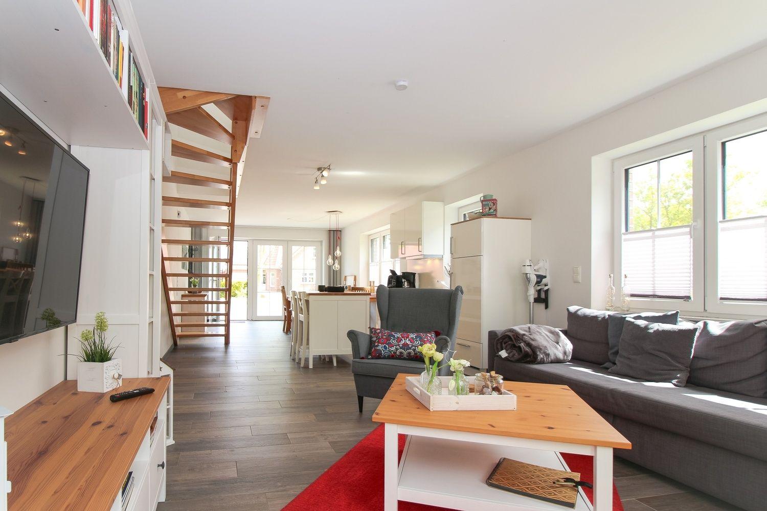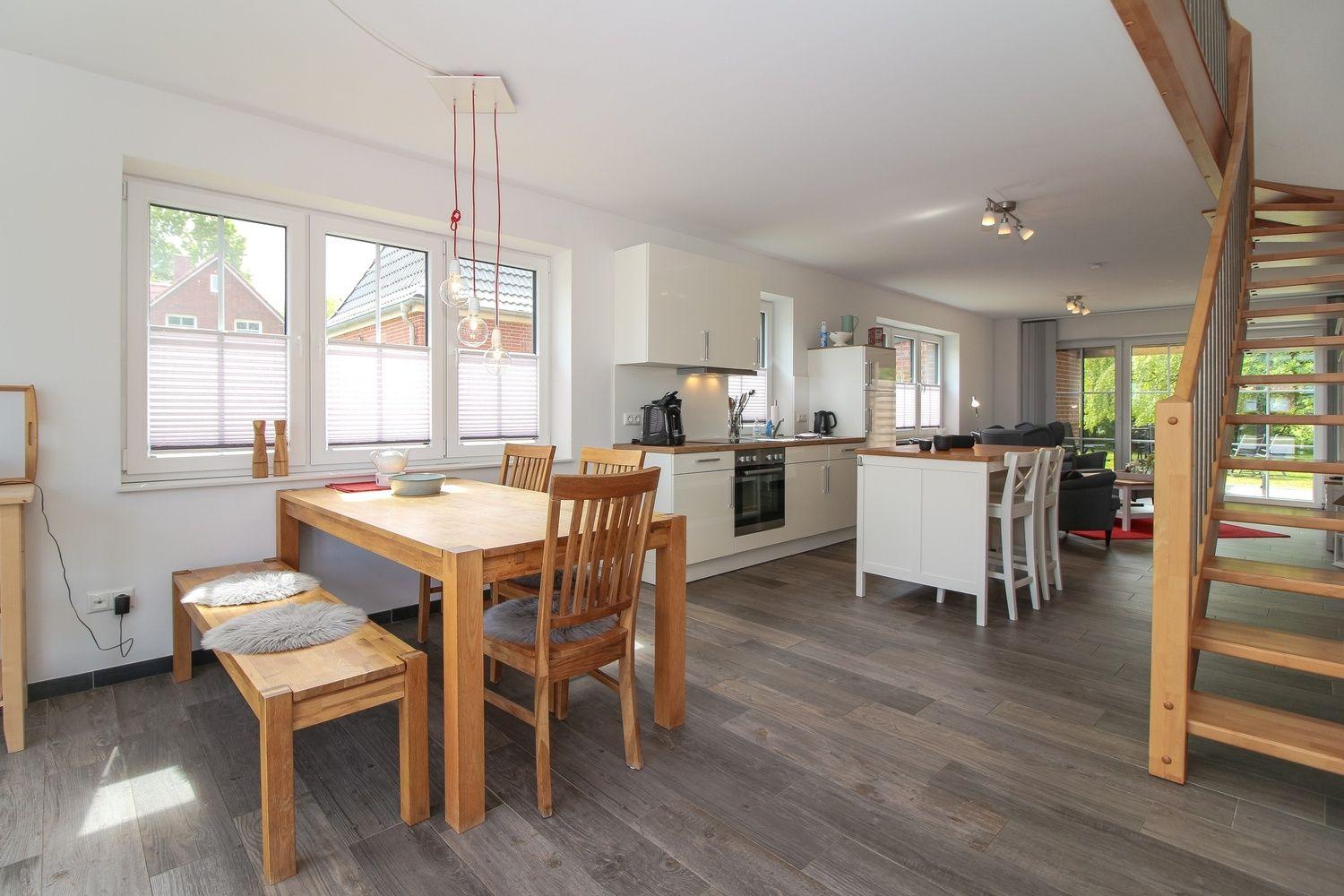 Die Ferienwohnung Zum Eisenlager wurde im Februar 2020 fertiggestellt. Die hochwertig eingerichtete Ferienwohnung lässt keine Wünsche offen. Große Fensterfronten am Eingang und an der Terrassenseite sorgen für ein helles und freundliches Ambiente. Im Parterre haben Sie eine offene Küche mit großem Essbereich. Im Wohnbereich lädt eine moderne Couchgarnitur zu gemütlichen Abenden/Fernsehabenden mit Flachbild TV einladen. Vom Wohnzimmer aus haben Sie einen freien Blick in den großen Garten mit einer Liegewiese. Hier geht es auf die Terrasse, die zum frische Luft schnappen und Sonnenbaden einlädt. Der Blick auf das weite Land ist herrlich entspannend. Die hellen Schlafräume befinden sich im Obergeschoss, ein Schlafzimmer mit Doppelbett (180 x 2 m, großes Laken erforderlich), Kleiderschrank und Flachbild TV und ein Schlafraum mit zwei Einzelbetten. Vom Bett aus haben Sie einen fantastischen Ausblick auf die Felder. Die Fenster lassen sich per elektrischer Jalousien verdunkeln. Der Name der Ferienwohnung hat einen historischen Hintergrund: das neu erbaute Gebäude mit insgesamt drei Ferienwohnungen stammt aus der alten Dorfschmiede Prahst. Zum Gebäude gehört ein 1.000 qm großes Grundstück. Im angrenzender Fahrradschuppen könnten mitgebrachte Fahrräder untergebracht werden. WLAN ist verfügbar! Ihr Hund ist herzlich willkommen!