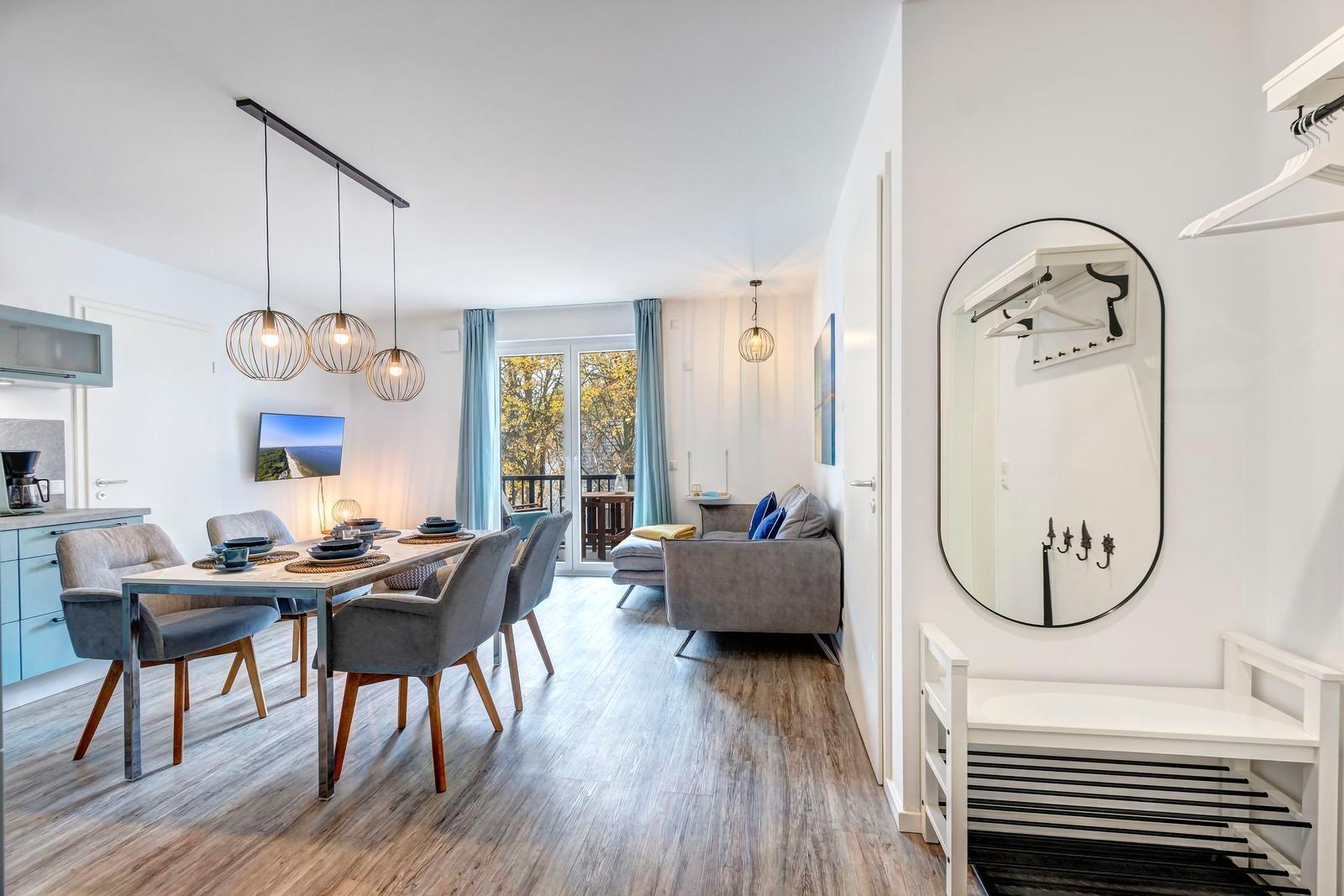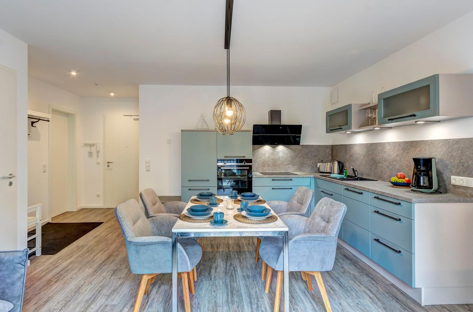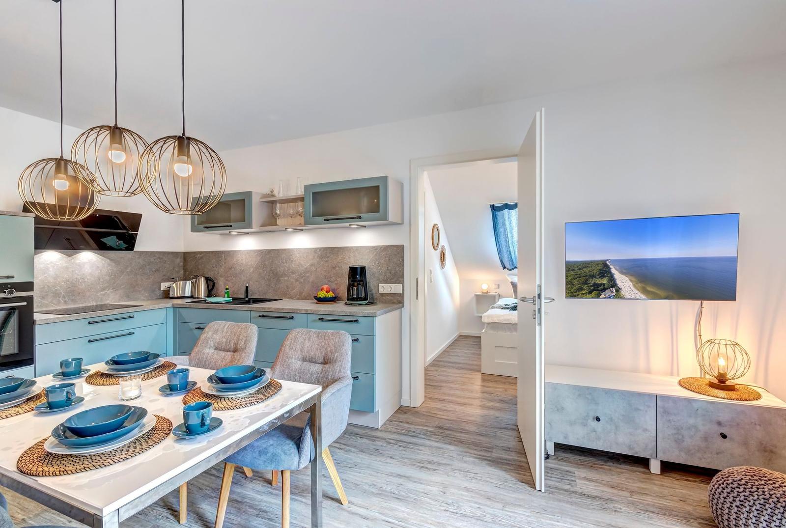 Im Bernsteinquartier 11/90 in Kölpinsee erwartet die Gäste eine moderne Ferienwohnung im zweiten Obergeschoss mit 70 m² Wohnfläche. Die stilvoll eingerichtete Unterkunft umfasst einen offenen Wohnbereich mit großzügigem Esstisch, einer modernen Küche, die mit Induktionskochfeld, Backofen und Geschirrspüler ausgestattet ist. Zwei geschmackvoll eingerichtete Schlafzimmer mit Boxspringbetten bieten höchsten Schlafkomfort. Das Badezimmer verfügt über eine Badewanne, während ein separates Gästebad mit bodengleicher Dusche vorhanden ist. Zur Ausstattung gehört auch eine Waschmaschine sowie ein Trockner. Kostenfreies WLAN und ein privater Stellplatz am Haus runden das Angebot ab. Die Betten sind bezogen und Handtücher liegen bereit, sodass sich die Gäste direkt wohlfühlen können. Gemeinschaftliche Einrichtungen, wie ein abschließbarer Fahrradraum, stehen ebenfalls zur Verfügung.