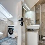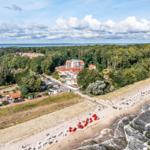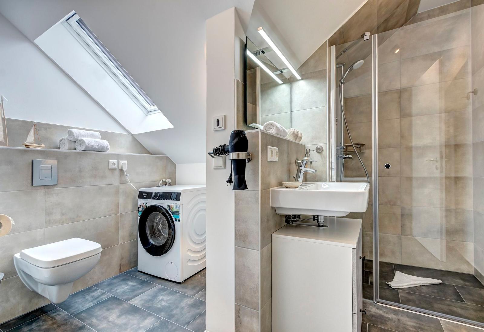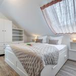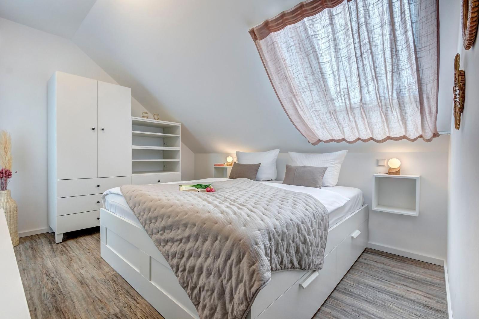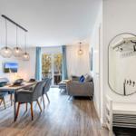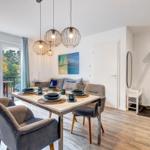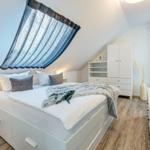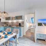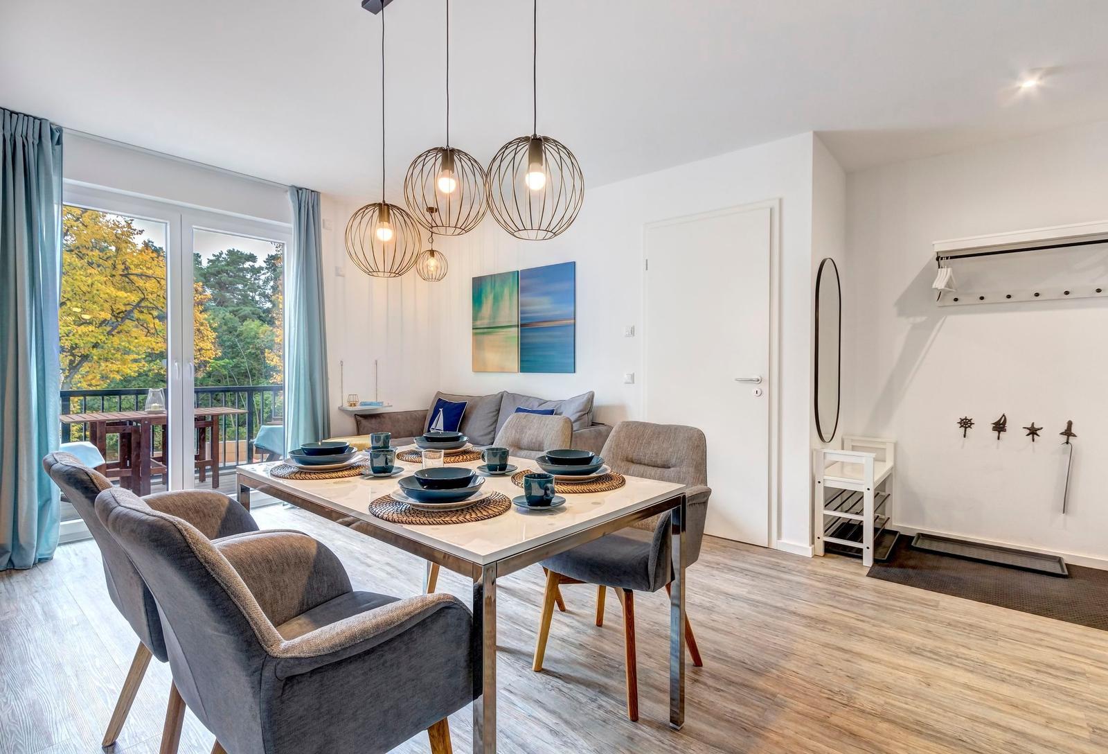 Im Bernsteinquartier 11/90 in Kölpinsee erwartet die Gäste eine moderne Ferienwohnung im zweiten Obergeschoss mit 70 m² Wohnfläche. Die stilvoll eingerichtete Unterkunft umfasst einen offenen Wohnbereich mit großzügigem Esstisch, einer modernen Küche, die mit Induktionskochfeld, Backofen und Geschirrspüler ausgestattet ist. Zwei geschmackvoll eingerichtete Schlafzimmer mit Boxspringbetten bieten höchsten Schlafkomfort. Das Badezimmer verfügt über eine Badewanne, während ein separates Gästebad mit bodengleicher Dusche vorhanden ist. Zur Ausstattung gehört auch eine Waschmaschine sowie ein Trockner. Kostenfreies WLAN und ein privater Stellplatz am Haus runden das Angebot ab. Die Betten sind bezogen und Handtücher liegen bereit, sodass sich die Gäste direkt wohlfühlen können. Gemeinschaftliche Einrichtungen, wie ein abschließbarer Fahrradraum, stehen ebenfalls zur Verfügung.