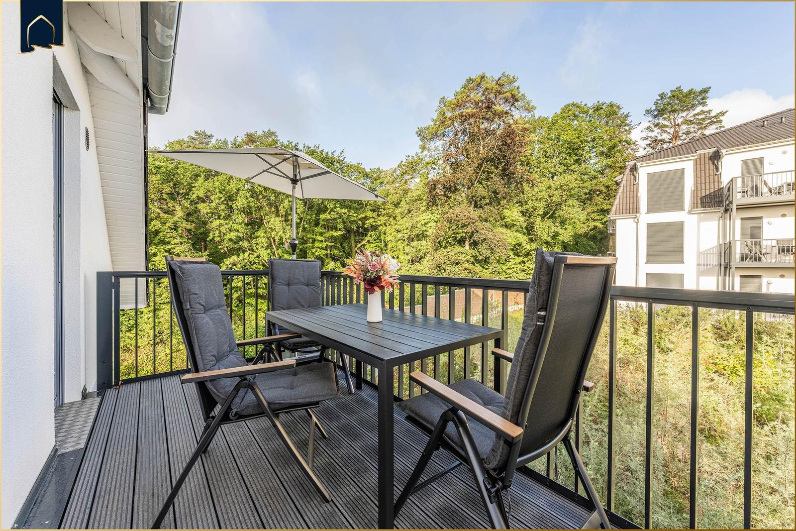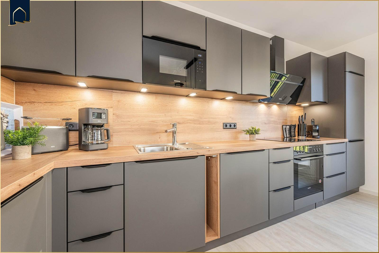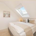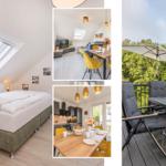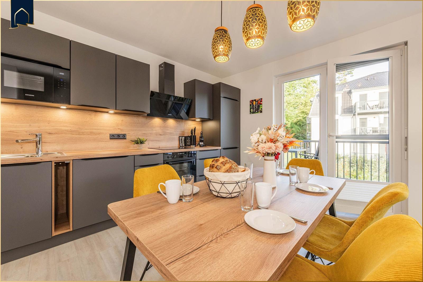 Die moderne Ferienwohnung Fewo Kleckerburg in Kölpinsee auf Usedom bietet auf 67 m² stilvollen Komfort für bis zu vier Gäste. Im dritten Stock, bequem per Aufzug erreichbar, befinden sich zwei separate Schlafzimmer, ein heller Wohnbereich sowie ein stilvolles Badezimmer mit bodengleicher Dusche. Die offene, voll ausgestattete Küche umfasst einen Ceranherd, Backofen, Mikrowelle, Spülmaschine und Kühlschrank mit Gefrierfach. Zwei große Flachbild-TVs und WLAN stehen für Unterhaltung zur Verfügung.