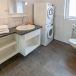 Im Schlafzimmer steht ein Doppelbett in modernem Design sowie weiteres funktionales Mobiliar zur Verfügung. Ein echter Hingucker ist jedoch das große elegante Tageslichtbad. Die modernen Fliesen in Weiß und Dunkelbraun wurden mit offensichtlicher Stilsicherheit gewählt. Die riesige ebenerdige Dusche mit Glaswand ist das Highlight dieses Raumes, der an einen Wellnesstempel erinnert. Zu Ihrem persönlichen Komfort sind Waschmaschine und Trockner vorhanden. Auch ein Haartrockner muss nicht eigens mitgebracht werden.