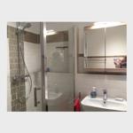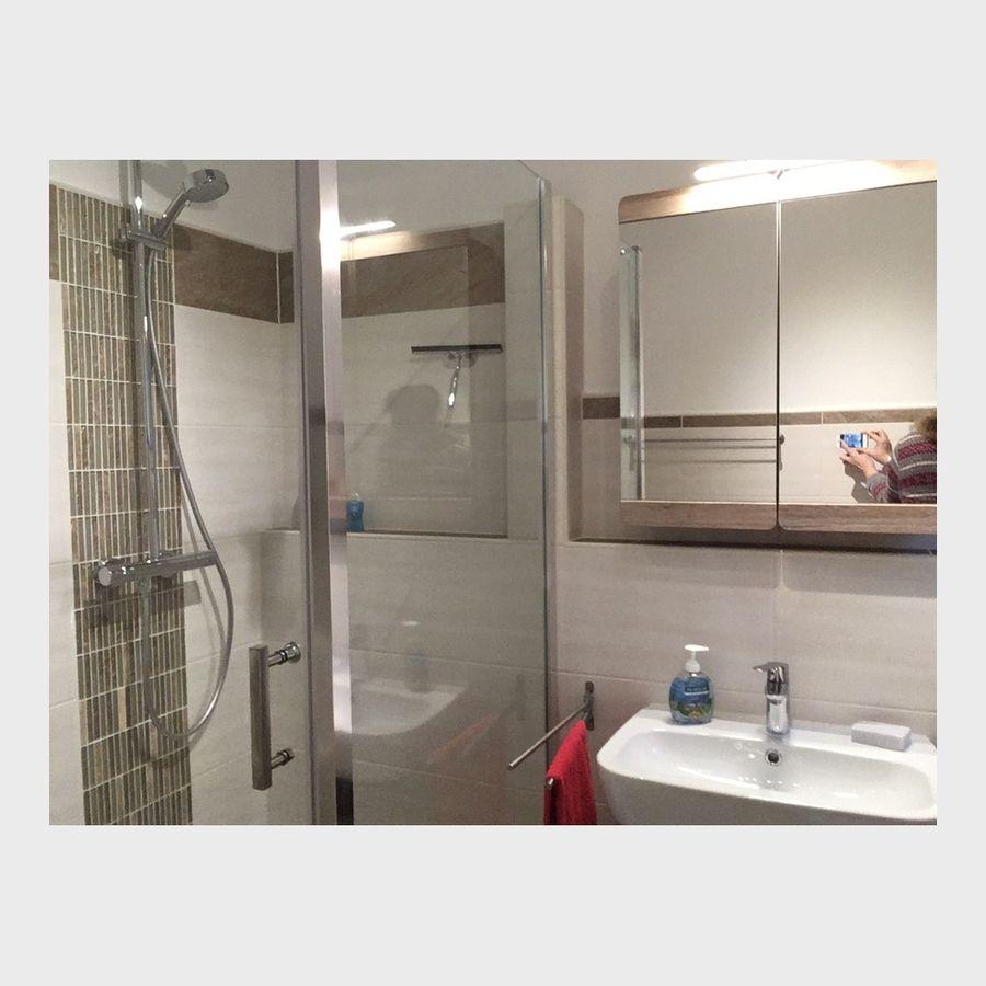 bodentiefe große Dusche, ist modern gefliest und eine Waschmaschine ist auch vorhanden.
