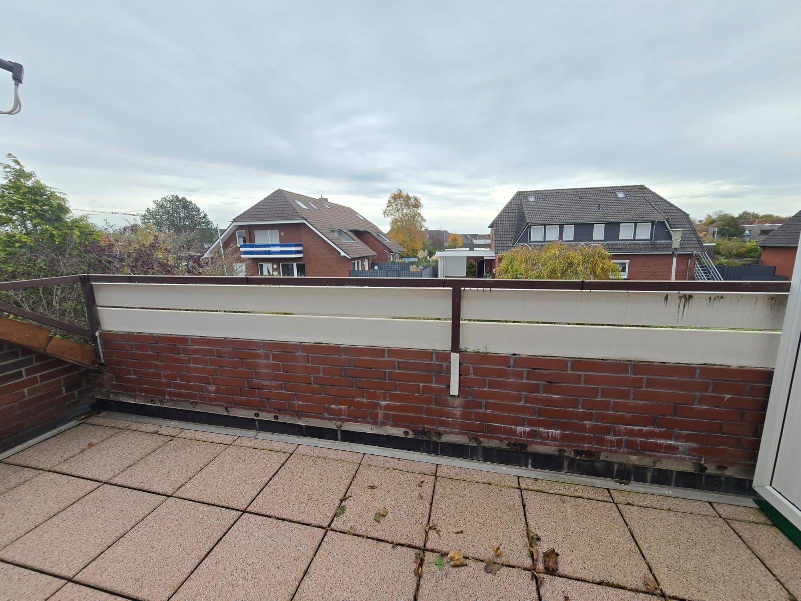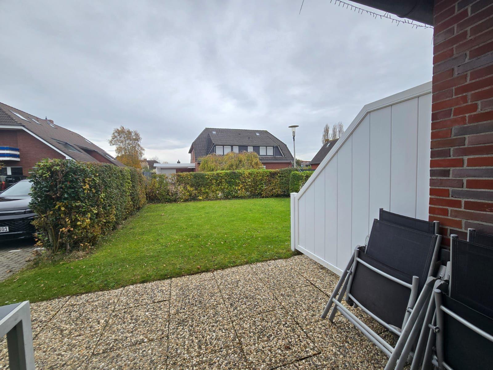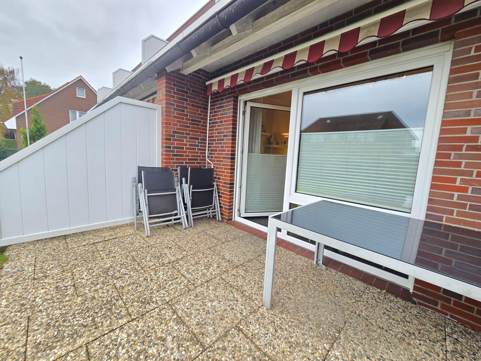 Die Ferienwohnung Norddeichurlaub bietet einen einladenden Außenbereich, der ideal für entspannende Stunden ist. Gäste können den sonnigen Balkon im Obergeschoss genießen, der direkten Zugang aus dem großzügigen Schlafzimmer bietet. Im Erdgeschoss lädt die Terrasse vor dem Wohnzimmer dazu ein, die frische Nordseeluft und die Sonne zu genießen.
