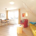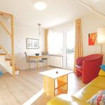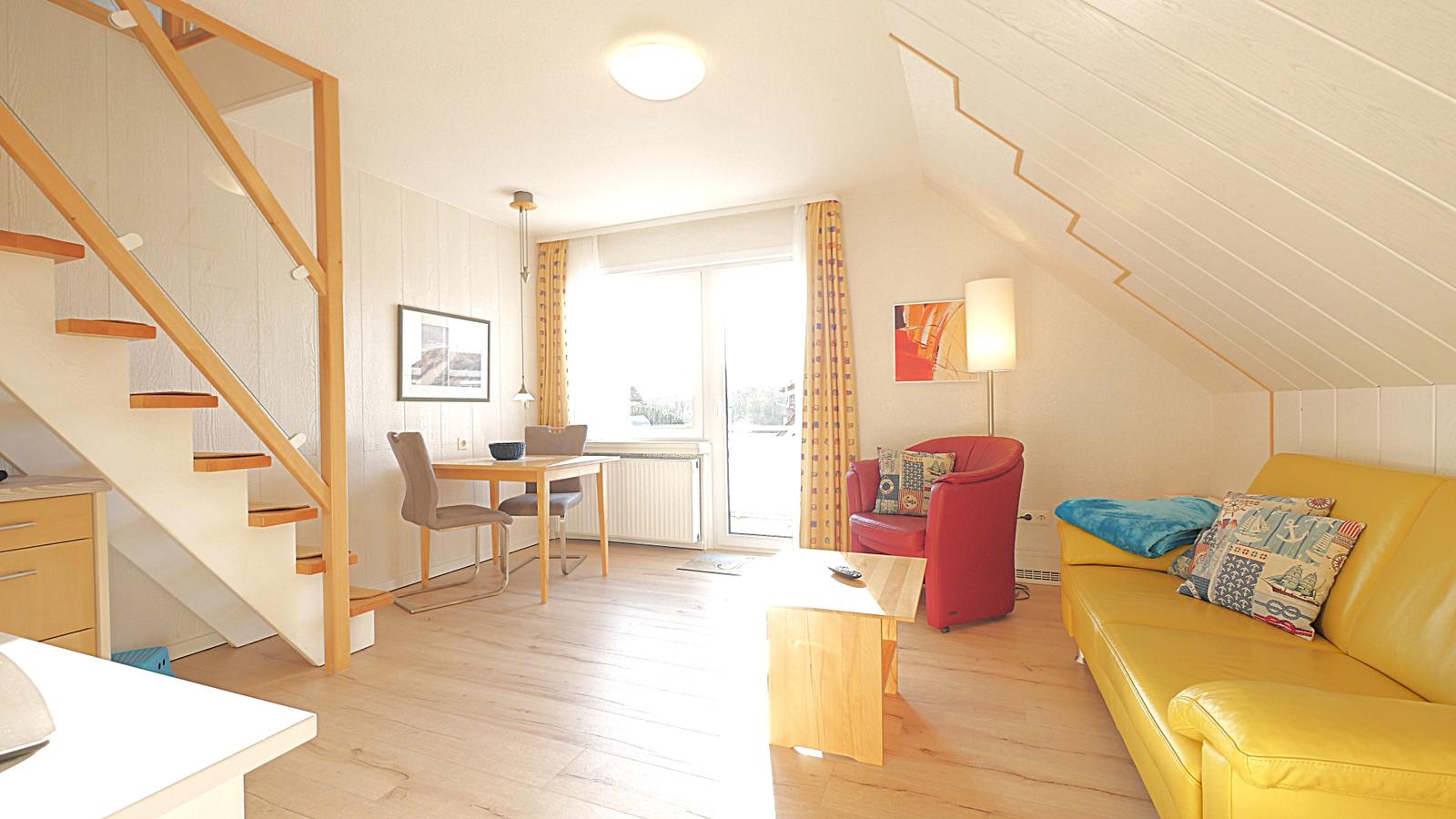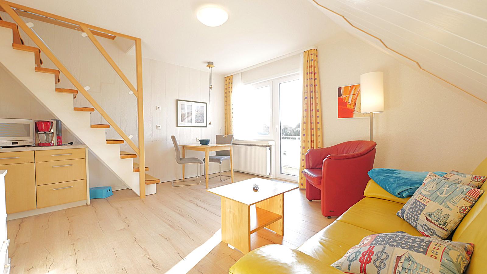 Die lichtdurchflutete Wohnung befindet sich in der 1. Etage und erstreckt sich über 2 Ebenen. Im Eingangsbereich finden Sie eine separate Küchenzeile, den Wohn - / Essbereich mit echtem Kernbuchen-Holztisch und hochwertigen Lederschwingern, den Balkon sowie Dusche / WC.
