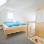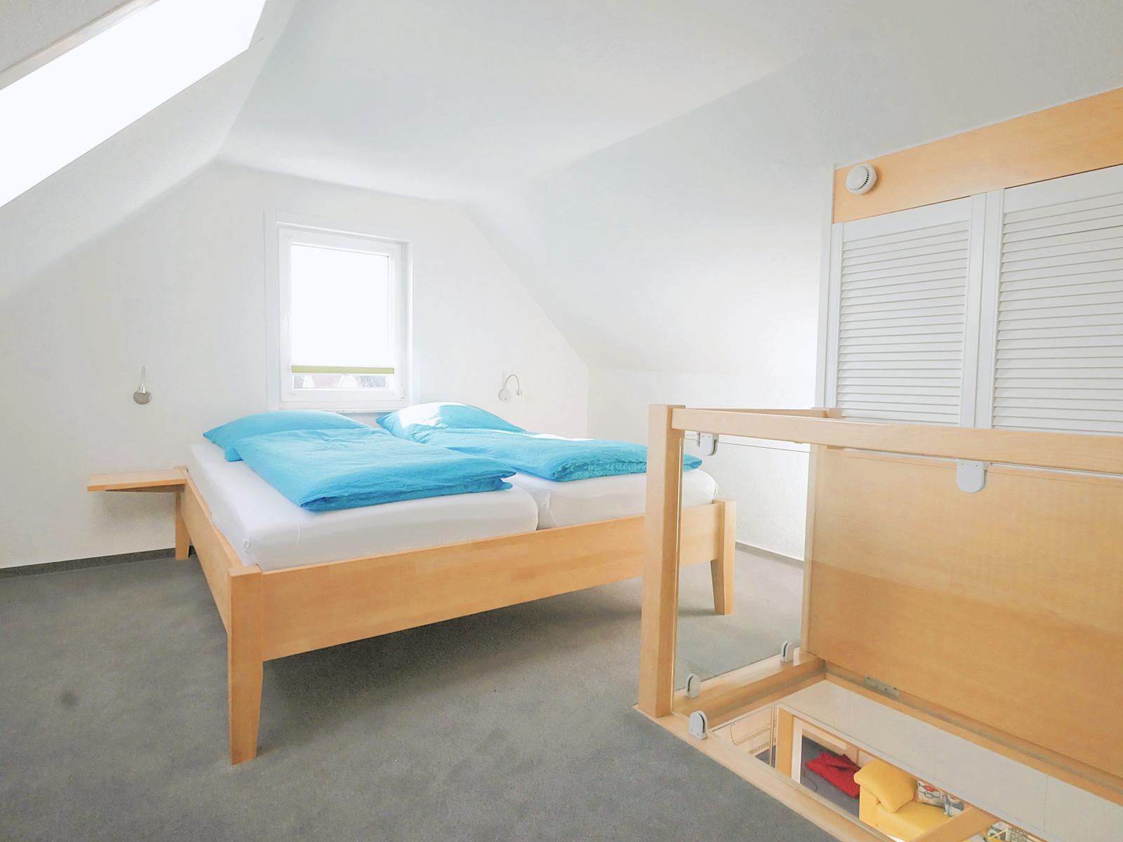 Die obere Etage besteht aus einem separaten Schlafzimmer mit Doppelbett incl. verstellbarem Lattenrost, Kaltschaummatratzen mit Encasings, einem Einbau-Kleiderschrank sowie Ablagefächern. Es kann mit Verdunkelungsplissee und