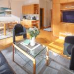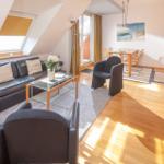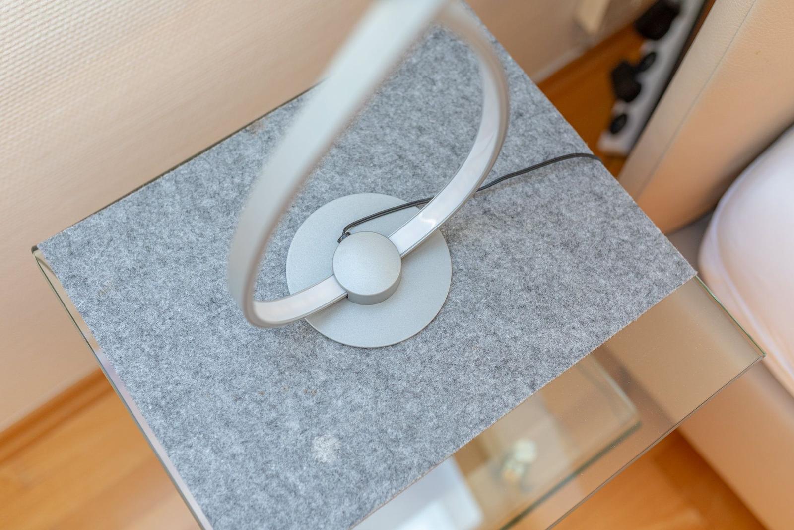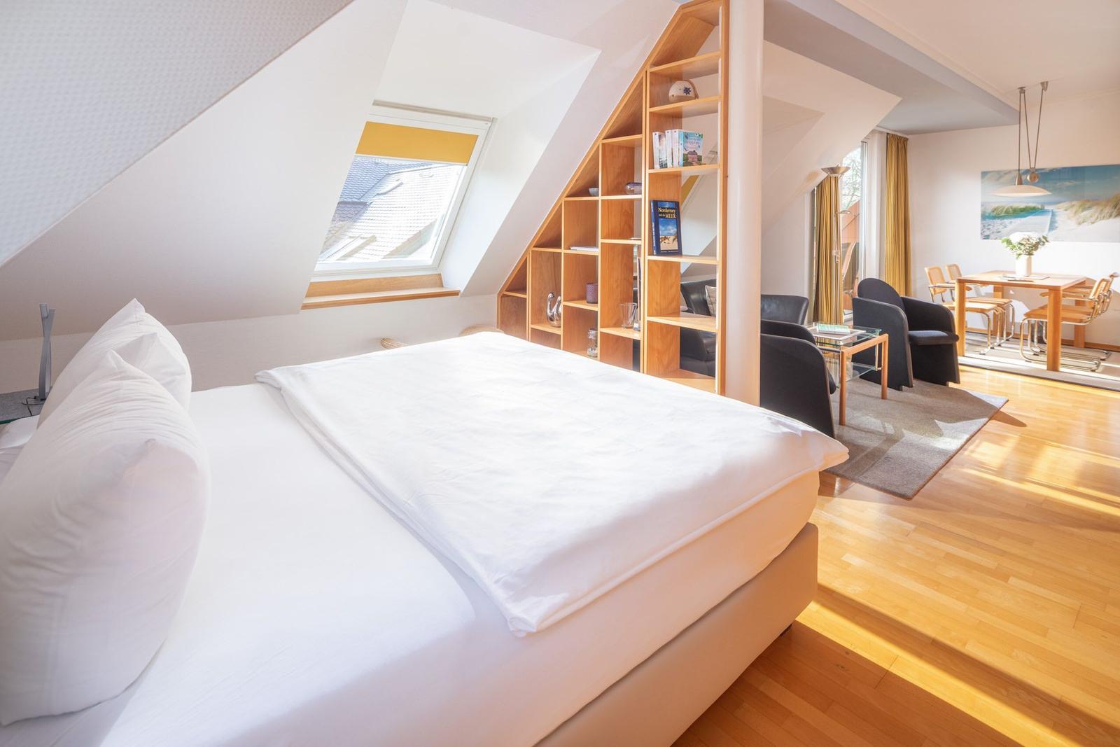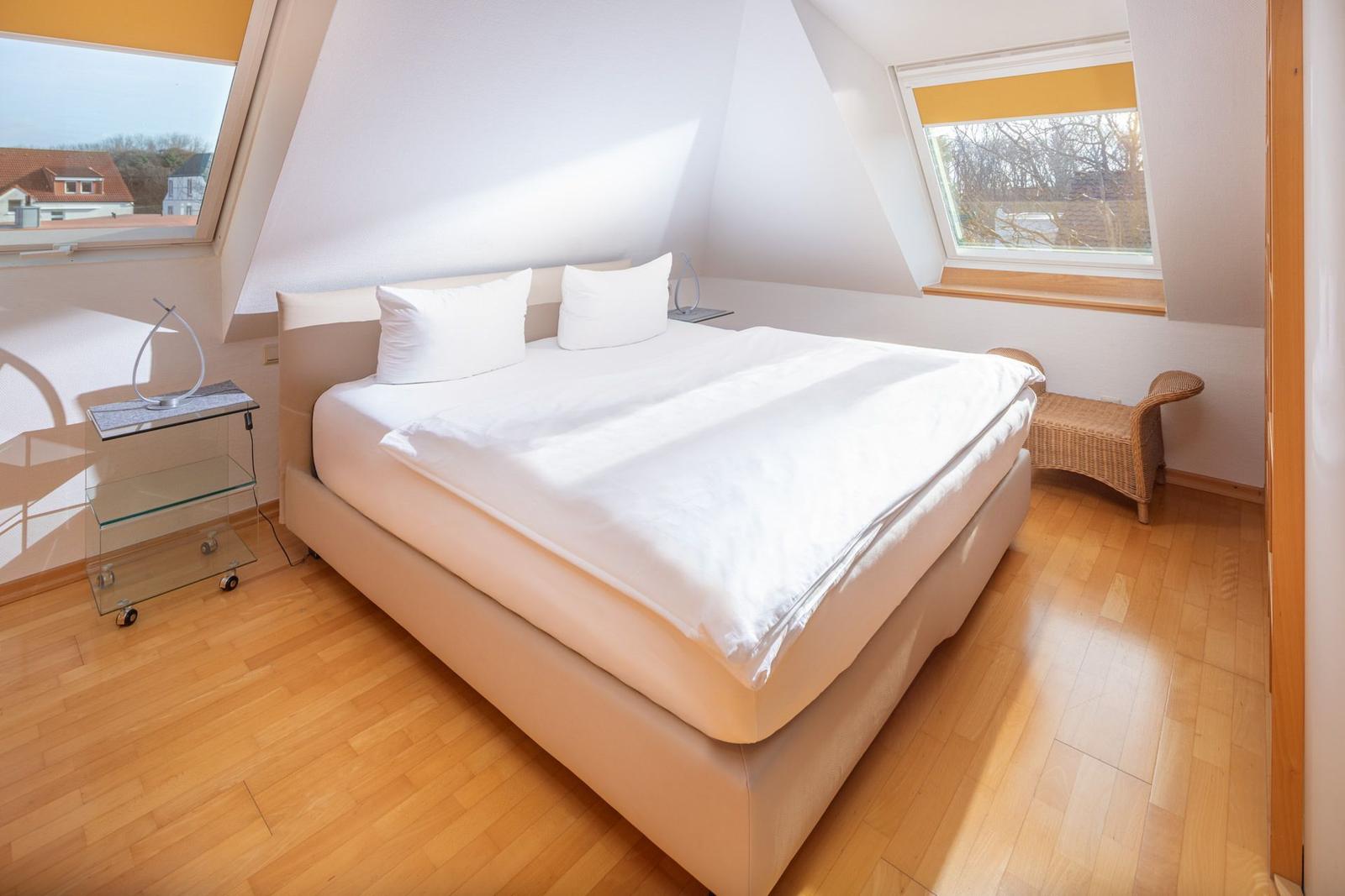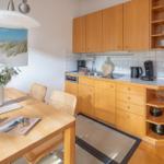 Die Ferienwohnung bietet einen komfortablen Rückzugsort und besticht durch ihre durchdachte Ausstattung. Das geräumige Schlafzimmer verfügt über ein gemütliches Doppelbett, während das Badezimmer mit einer modernen Dusche und einem Haartrockner ausgestattet ist. Die offene Küche lädt zum Kochen ein und bietet einen Geschirrspüler, einen Elektro-/Gasherd, einen Kühlschrank mit Gefriermöglichkeit sowie eine Kaffeemaschine, einen Toaster und eine Wäscheablage. Der Esstisch bietet ausreichend Platz, um gemeinsame Mahlzeiten zu genießen. Für Unterhaltung sorgen eine HiFi-Anlage und ein TV. Innenräume sind allergikergeeignet und mit einem Sofa sowie Sesseln ausgestattet. Die Wohnung ist mit WLAN ausgestattet und bietet zusätzliche Annehmlichkeiten wie einen Wäschetrockner, eine Waschmaschine, einen Wasserkocher und Geschirr sowie Besteck. Ein Fahrstuhl erleichtert den Zugang, während eine Garderobe für zusätzlichen Stauraum sorgt. Hier findet jeder Gast einen gemütlichen und funktionalen Rückzugsort.