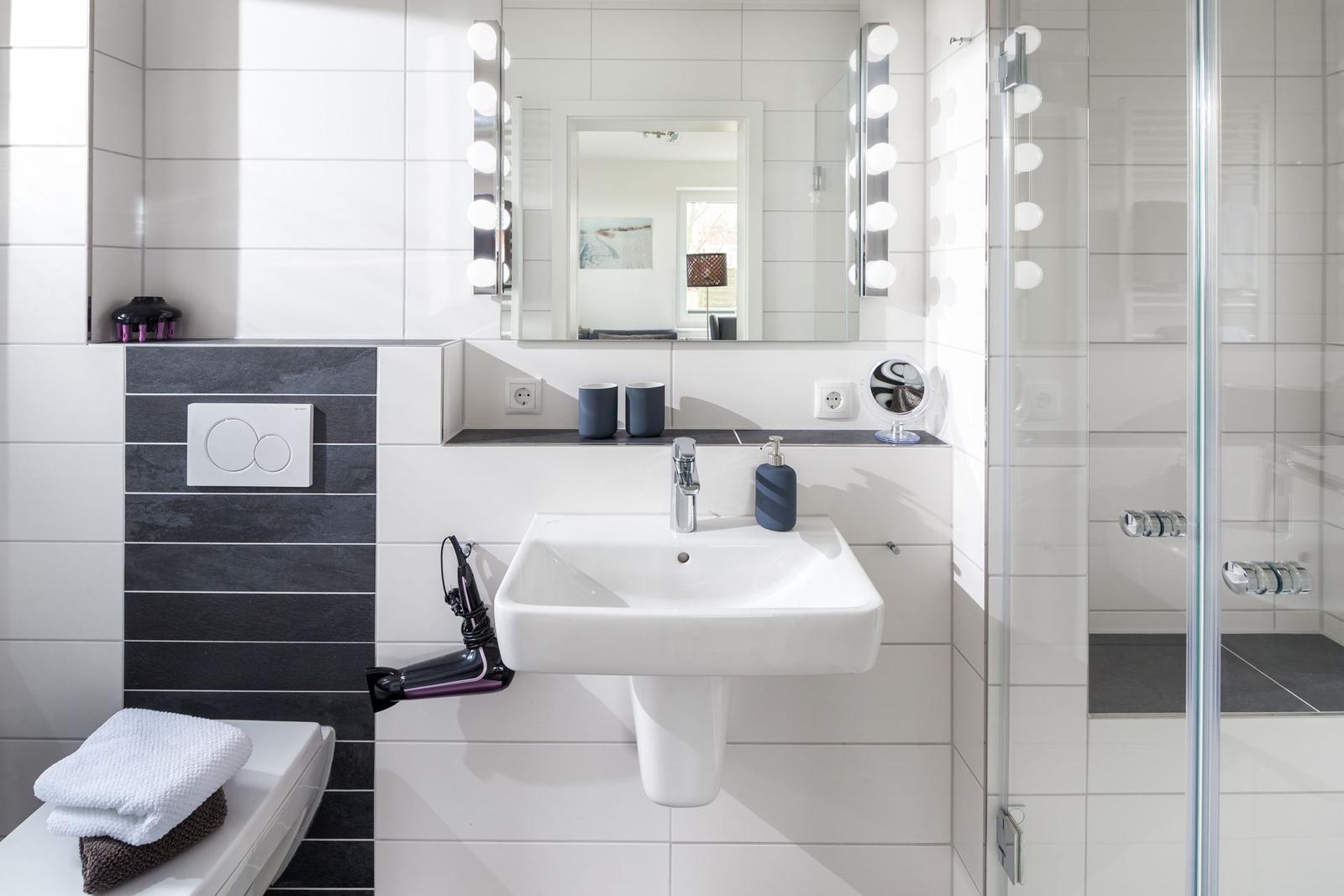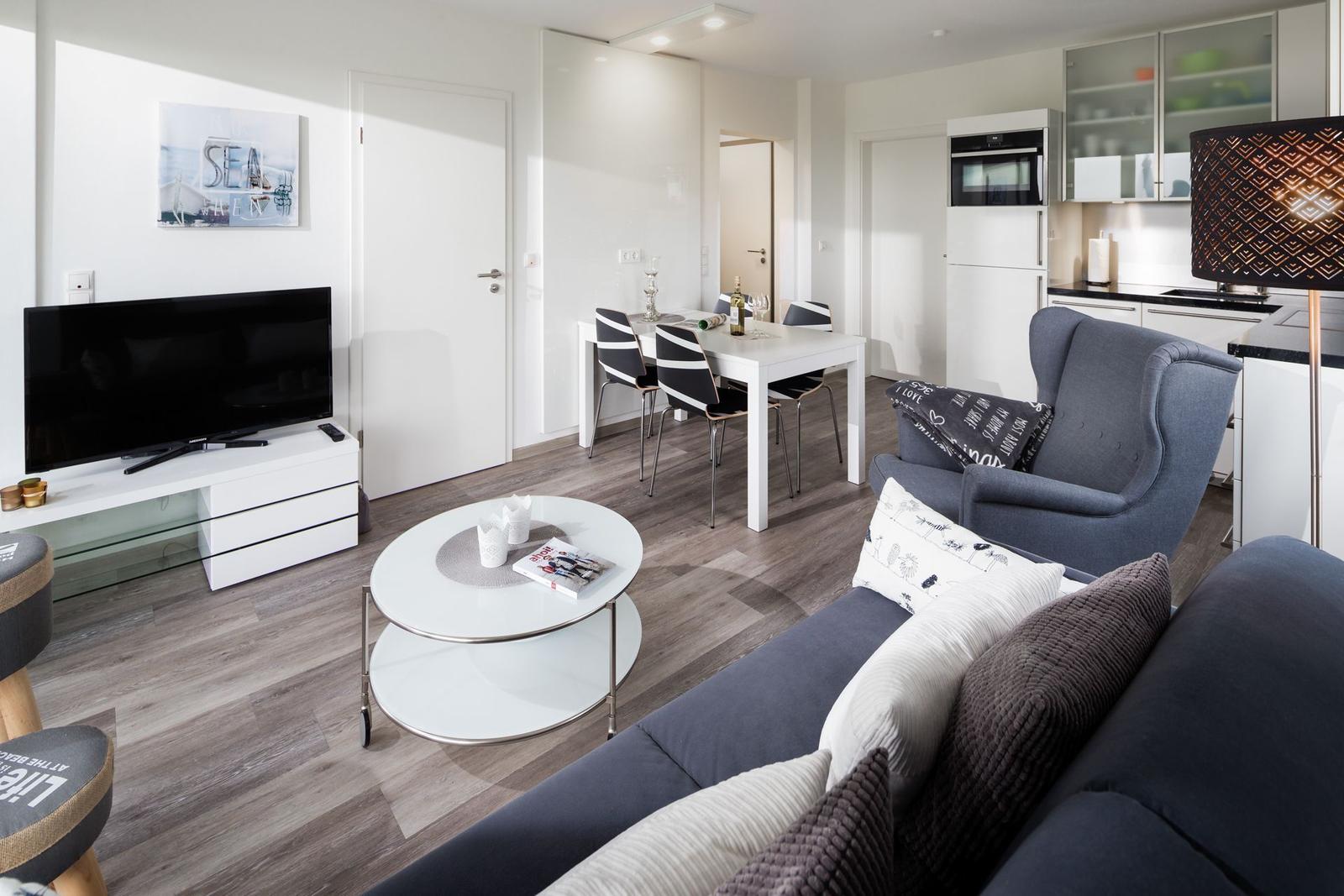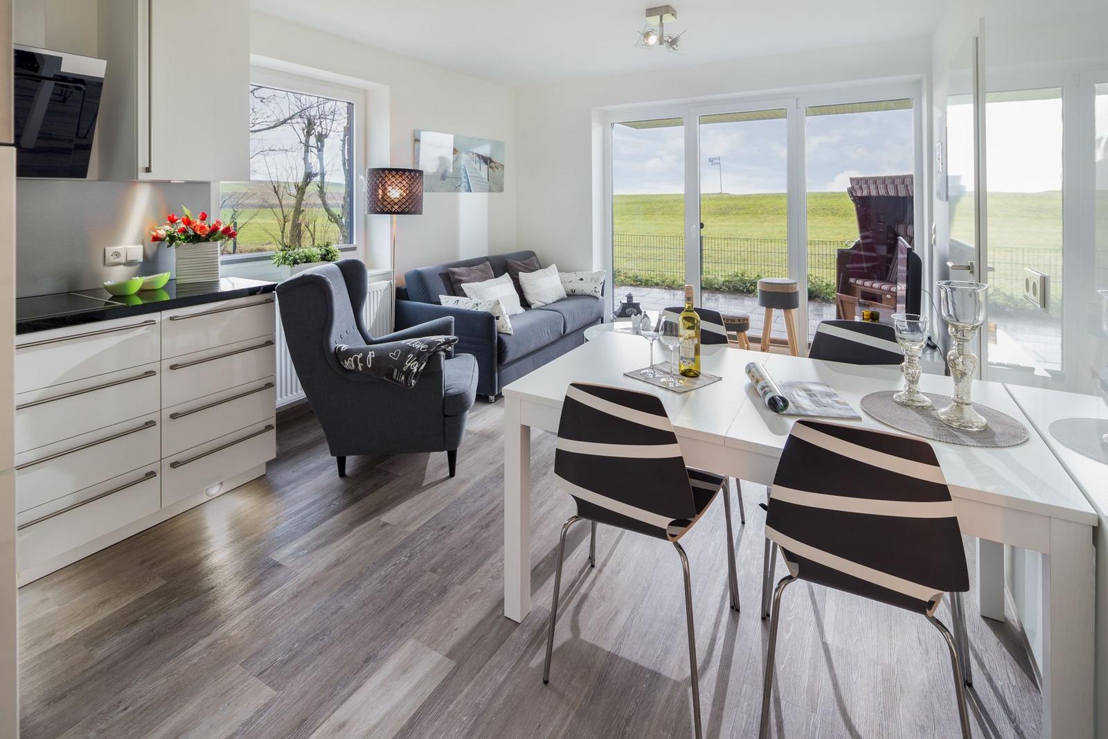 Die Ferienwohnung Deichblick 1 liegt direkt am U-Deich im Osten Norderneys und bietet Platz für zwei Personen. Ausgestattet mit einem komfortablen Doppelbett (2,00 m x 2,00 m) im Schlafzimmer, einem Wohnbereich mit Sofa, TV und WLAN sowie einer offenen Küche mit Geschirrspüler, Backofen, Mikrowelle und Kaffeemaschine, eignet sich die Wohnung ideal für eine entspannte Auszeit. Das Badezimmer ist mit einer bodentiefen Dusche versehen. Die Terrasse ist nach Süden ausgerichtet und mit einer Sitzgarnitur und einem Strandkorb ausgestattet, perfekt für sonnige Stunden. Im Haus stehen eine Waschmaschine und ein Trockner zur gemeinschaftlichen Nutzung zur Verfügung. Die moderne, helle Einrichtung und die ruhige Lage bieten alles, was Gäste für eine erholsame Zeit am Meer benötigen.