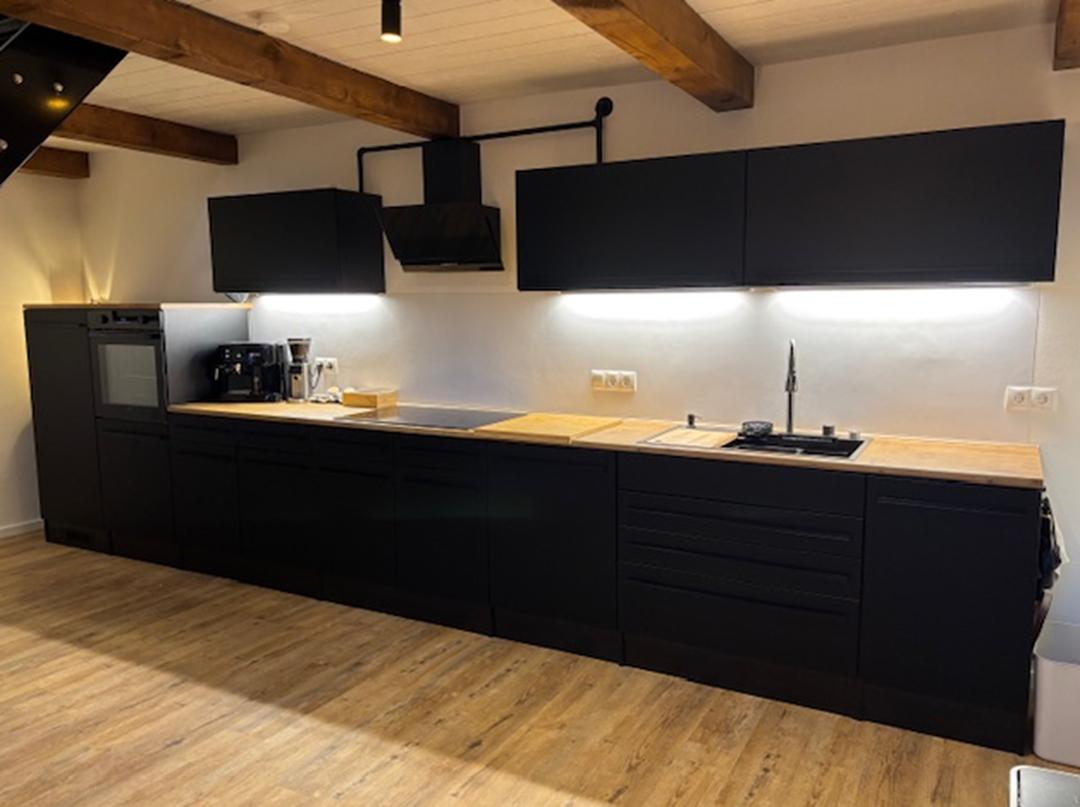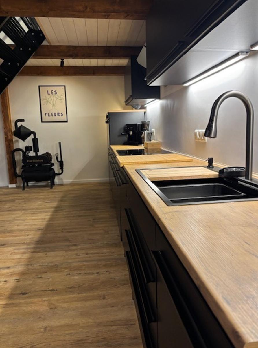 Die ca. 6,5 Meter lange Küchenzeile ist hochwertig ausgestattet und bietet umfangreiches Küchenzubehör – ideal für Selbstversorger, ohne dass Wünsche offenbleiben.