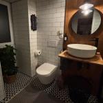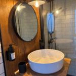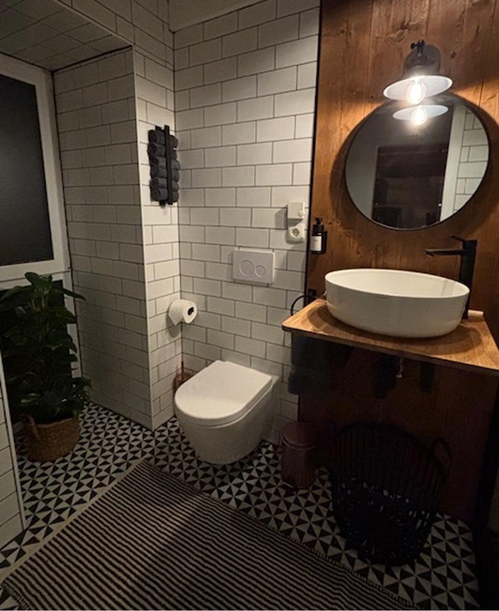 Das Badezimmer im Industrial-Style ist modern gestaltet und verfügt über eine großzügige, ebenerdige Dusche.