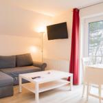 Das Duschbad ist funktional und bietet alles, was zu einem entspannten Aufenthalt erforderlich ist. Im Wohnzimmer sorgt ein TV für Unterhaltung. WLAN-Internet ermöglicht das Surfen und Streamen ohne Einschränkungen.