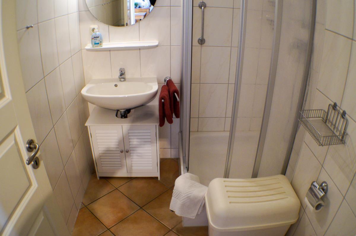 Das Badezimmer mit Dusche, Waschbecken und WC sowie Abstellmöglichkeiten für die vielen kleinen Utensilien des täglichen Bedarfs runden das Angebot dieses schönen Feriendomizils ab.