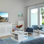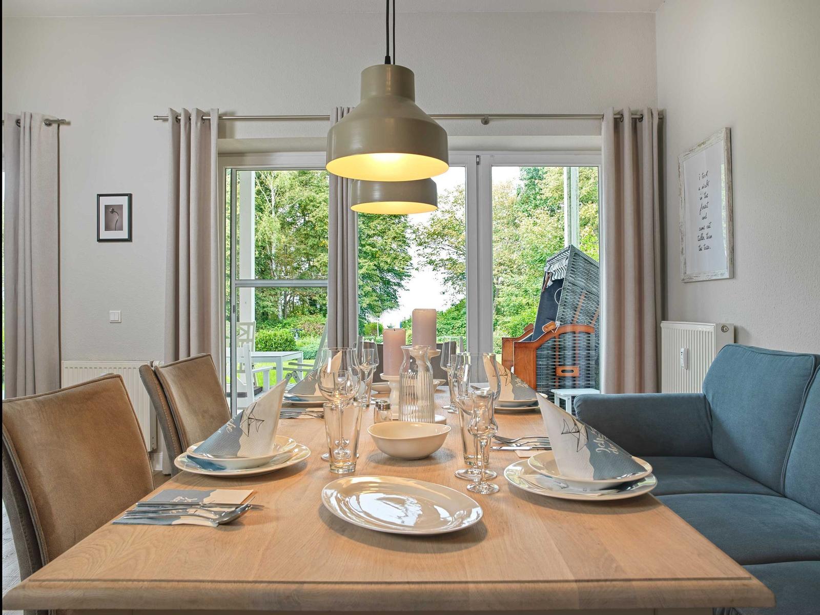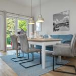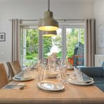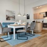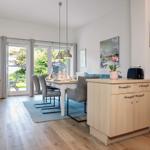Die offene Küche ist mit modernsten Geräten ausgestattet, darunter ein Geschirrspüler, Elektro- und Gasherd, Backofen, Mikrowelle, Kühlschrank, Gefriermöglichkeit, Kaffeemaschine und Toaster, ideal für die Zubereitung von Mahlzeiten. Ein Esstisch lädt zu gemeinsamen Stunden ein.
