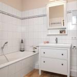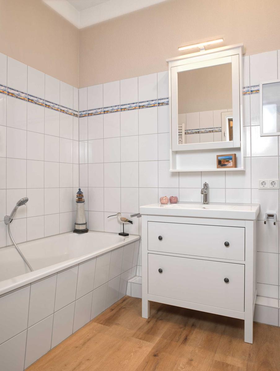 Das allergikergeeignete Badezimmer mit Fenster verfügt über eine Badewanne und bietet ausreichend Stauraum durch Schrank und Kommode.
