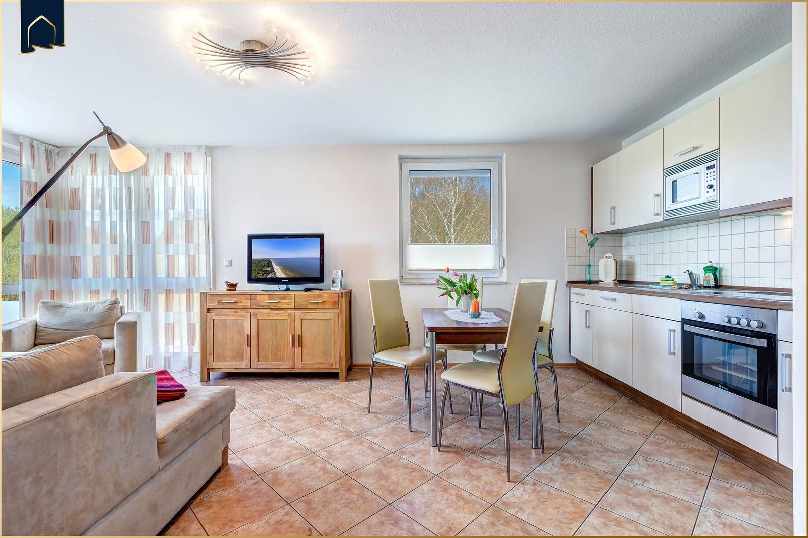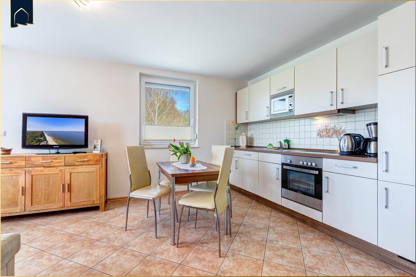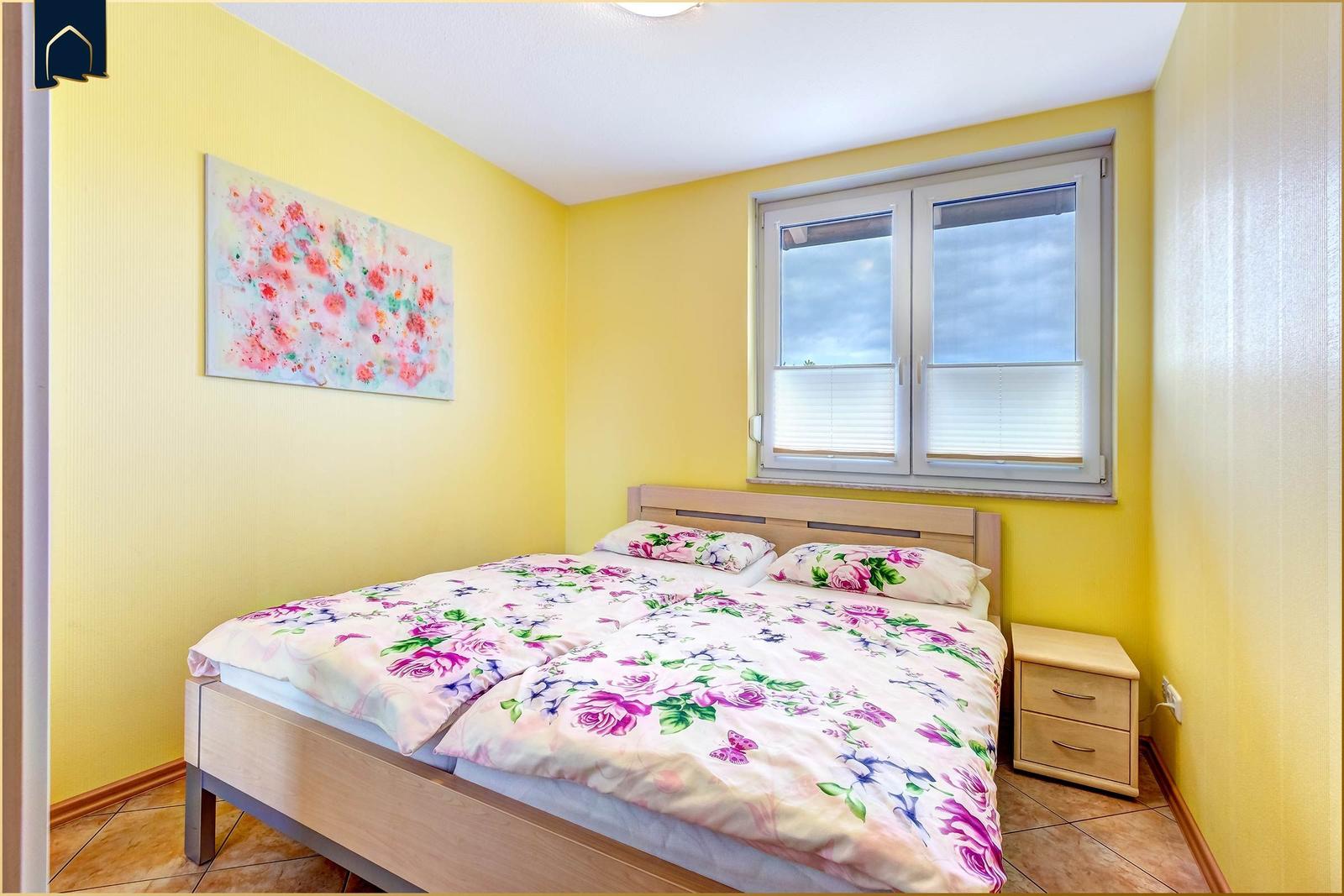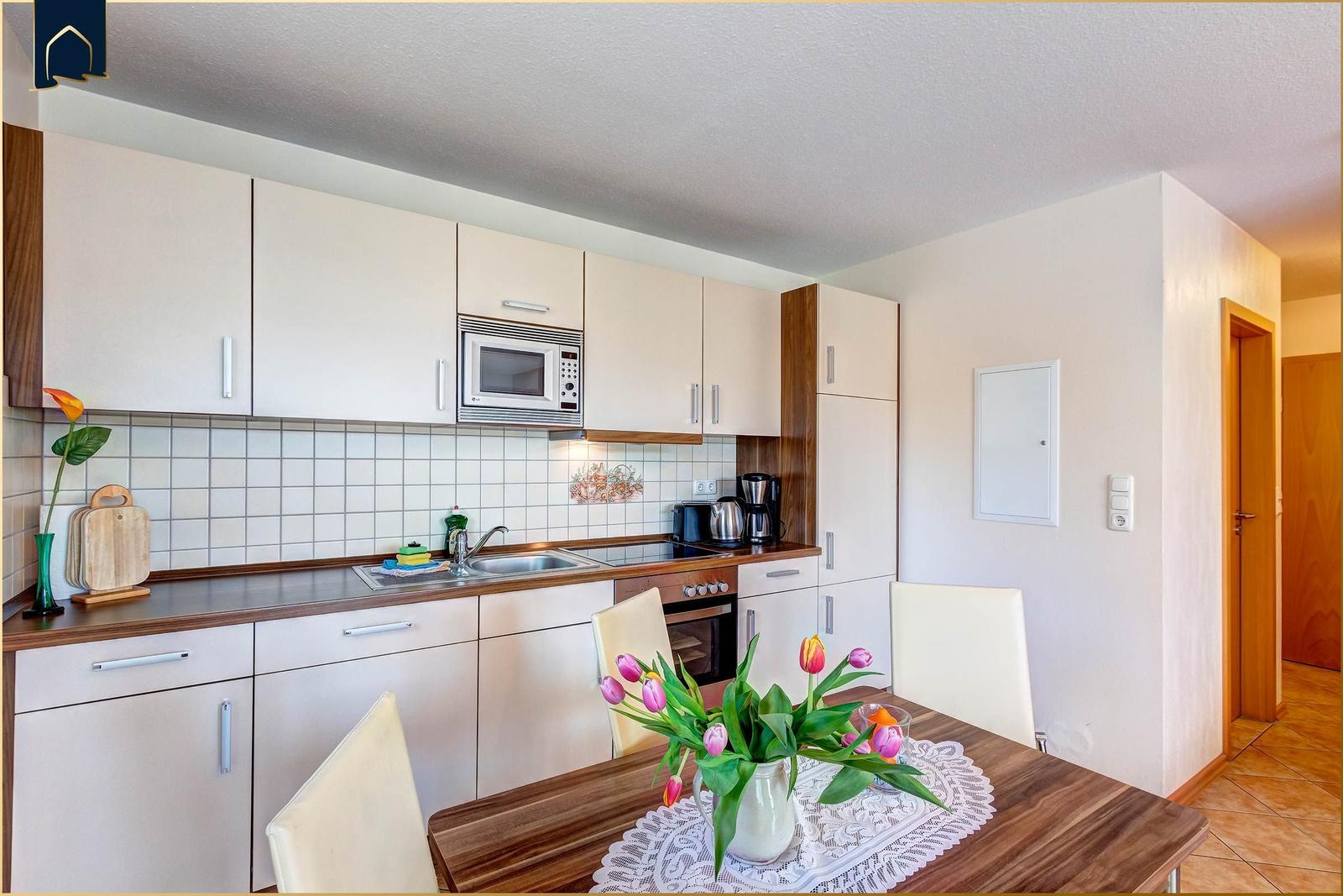 Die Ferienwohnung bietet eine einladende Atmosphäre und ist ideal für Allergiker geeignet. Im Schlafzimmer befindet sich ein komfortables Doppelbett, das zu erholsamen Nächten einlädt. Die offene Küche ist modern ausgestattet mit einem Elektro-/Gasherd, Backofen, Mikrowelle, Kühlschrank, Kaffeemaschine, Toaster und einer Gefriermöglichkeit, sodass die Zubereitung von Mahlzeiten leicht von der Hand geht.