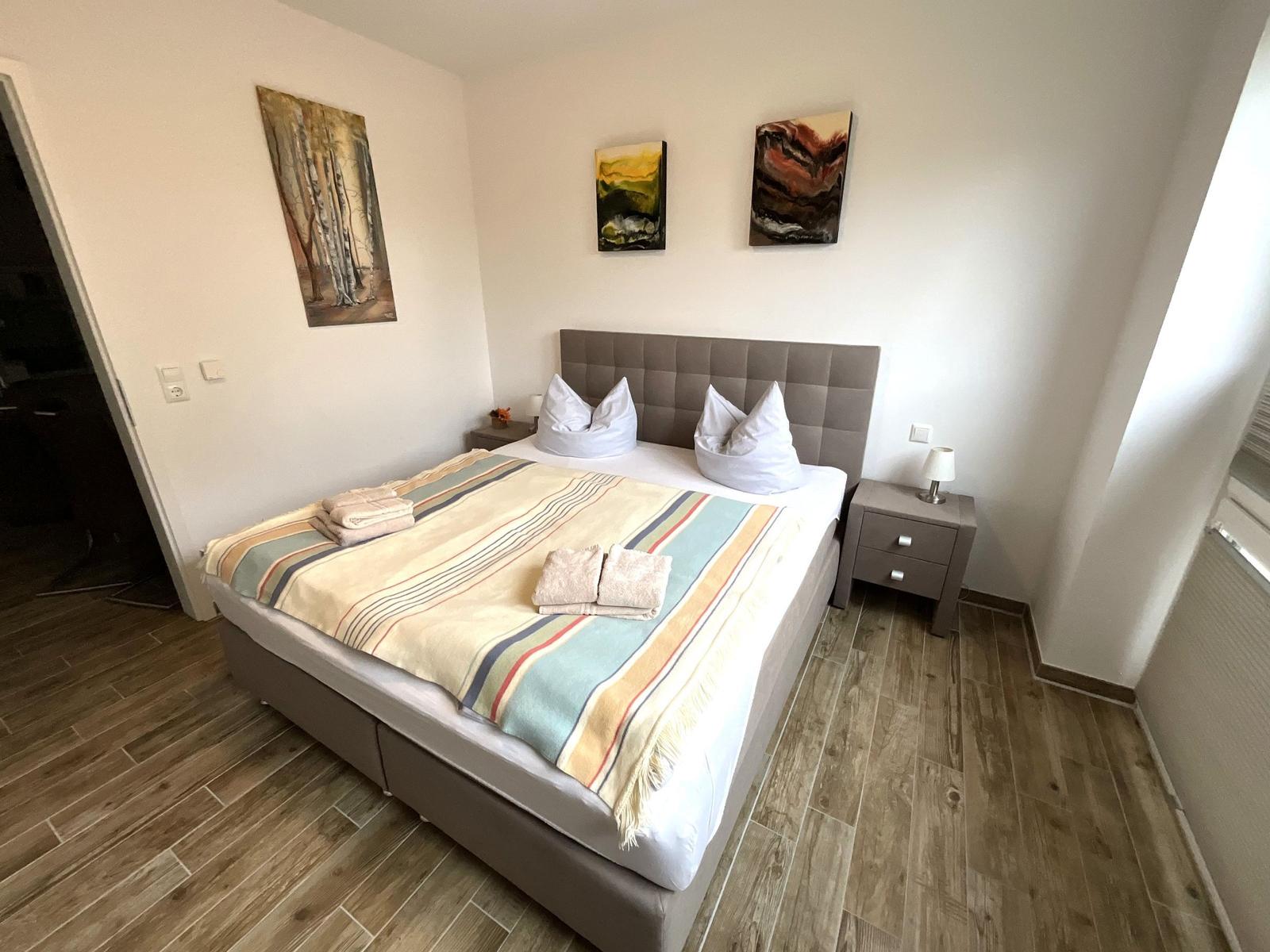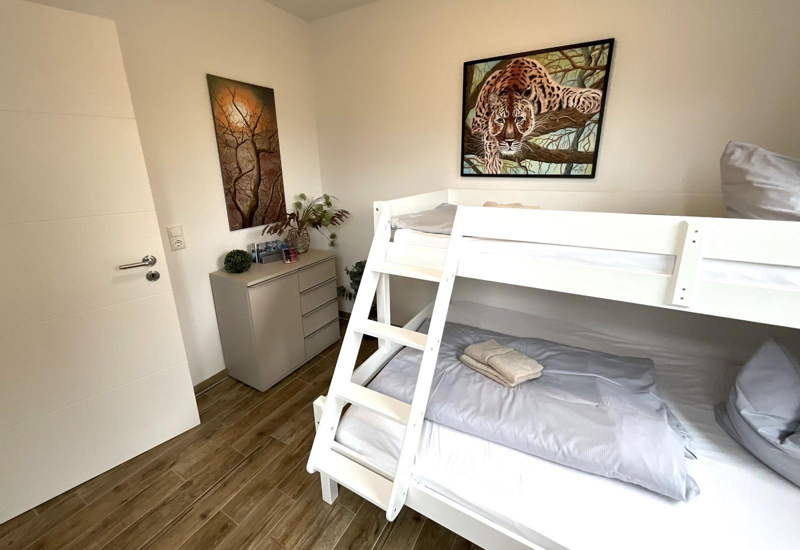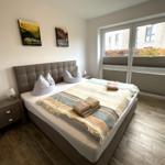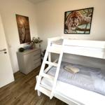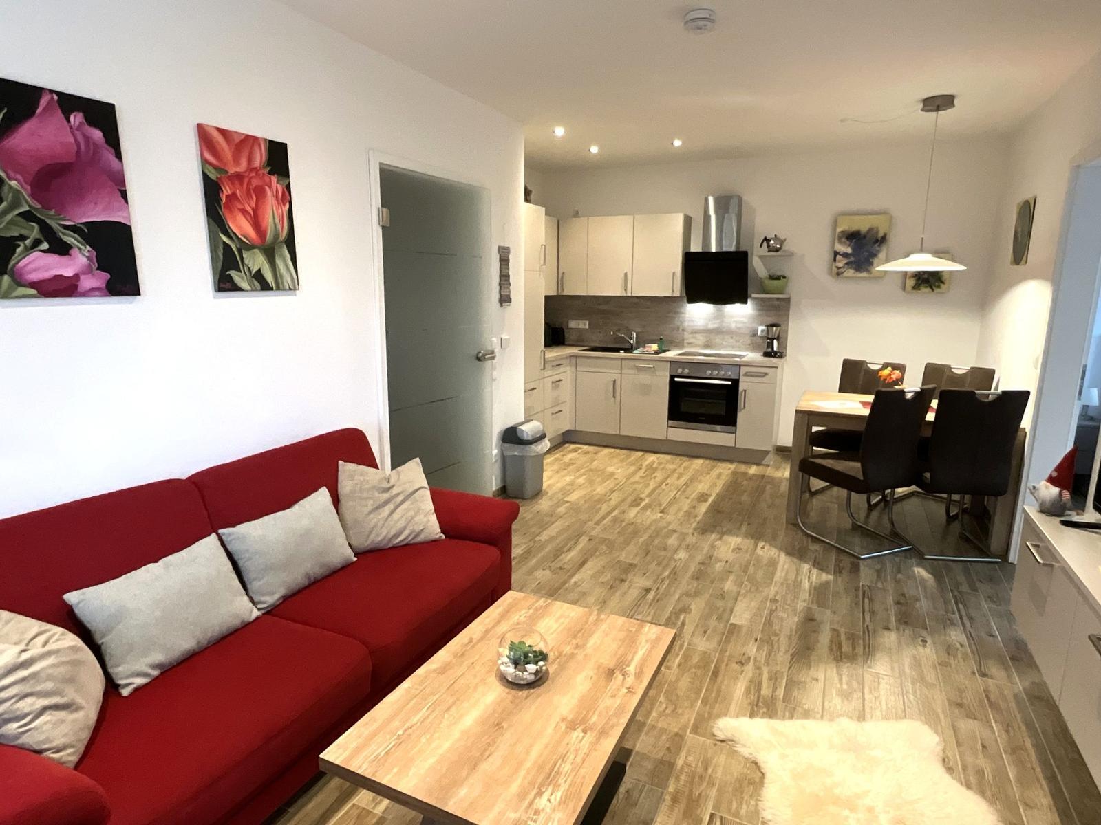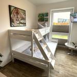 Die Ferienwohnung bietet eine ideale Rückzugsmöglichkeit für Erholungsuchende. Sie verfügt über ein gemütliches Schlafzimmer mit einem Doppelbett sowie ein Wohnschlafzimmer, in dem eine komfortable Schlafcouch bereitsteht. Das Badezimmer ist mit einer bodengleichen Dusche und einem Fenster ausgestattet, was für eine angenehme Belüftung sorgt. Die offene Küche ist modern und vollständig ausgestattet, inklusive Geschirrspüler, Backofen, Elektro-/Gasherd, Kühlschrank mit Gefriermöglichkeit, Mikrowelle und Kaffeemaschine. Für Familien ist ein Kinderhochstuhl vorhanden.