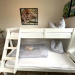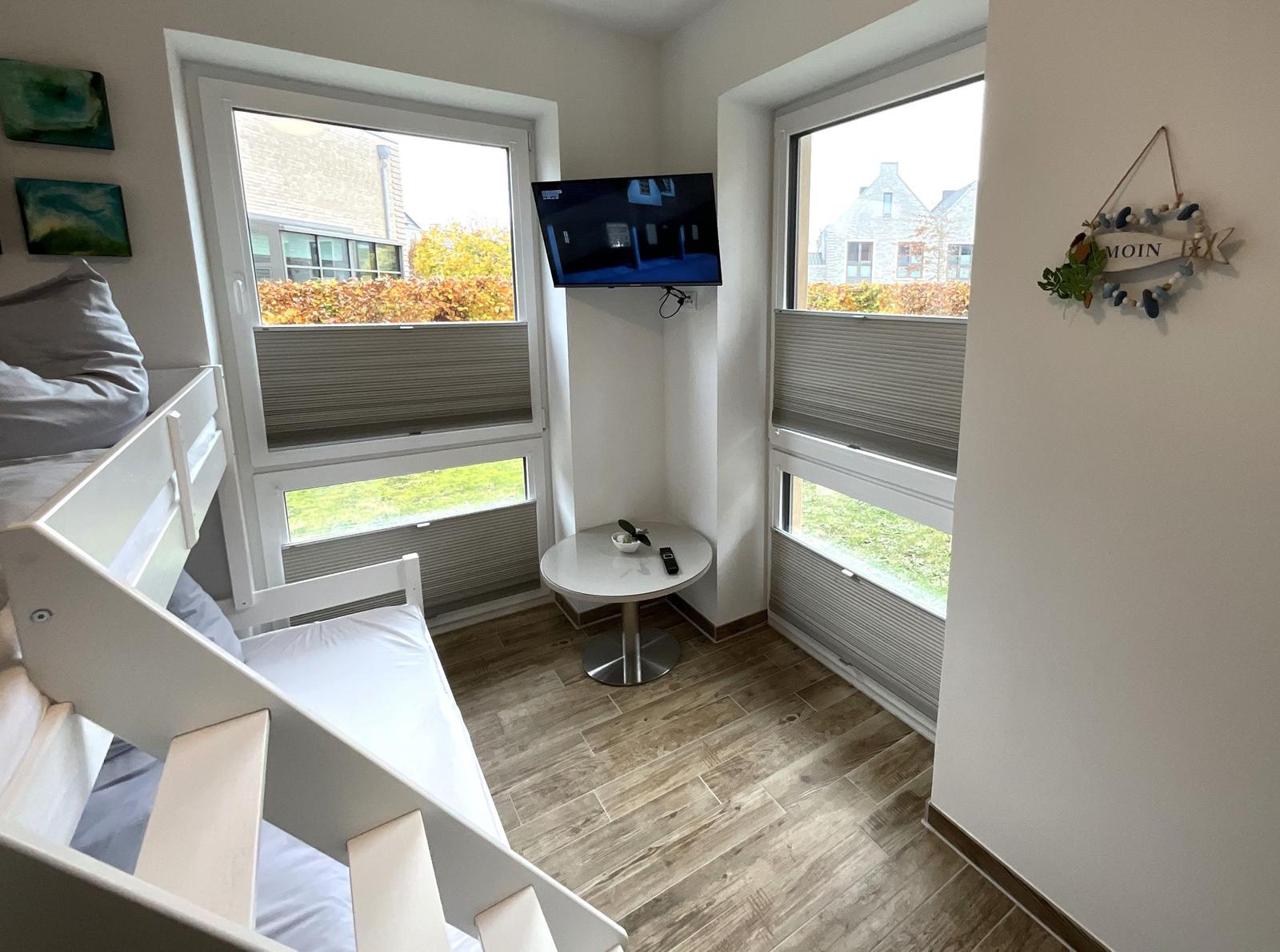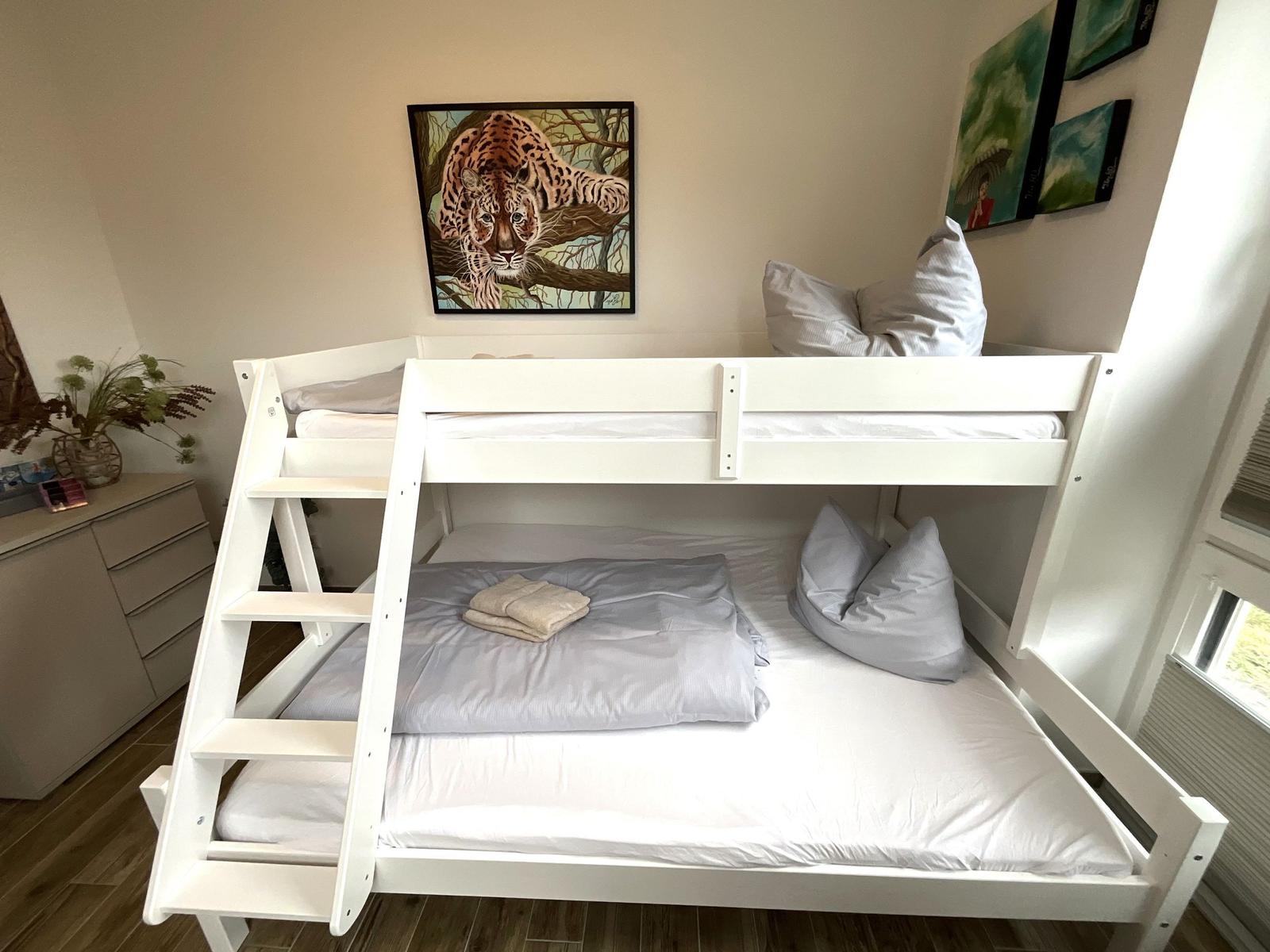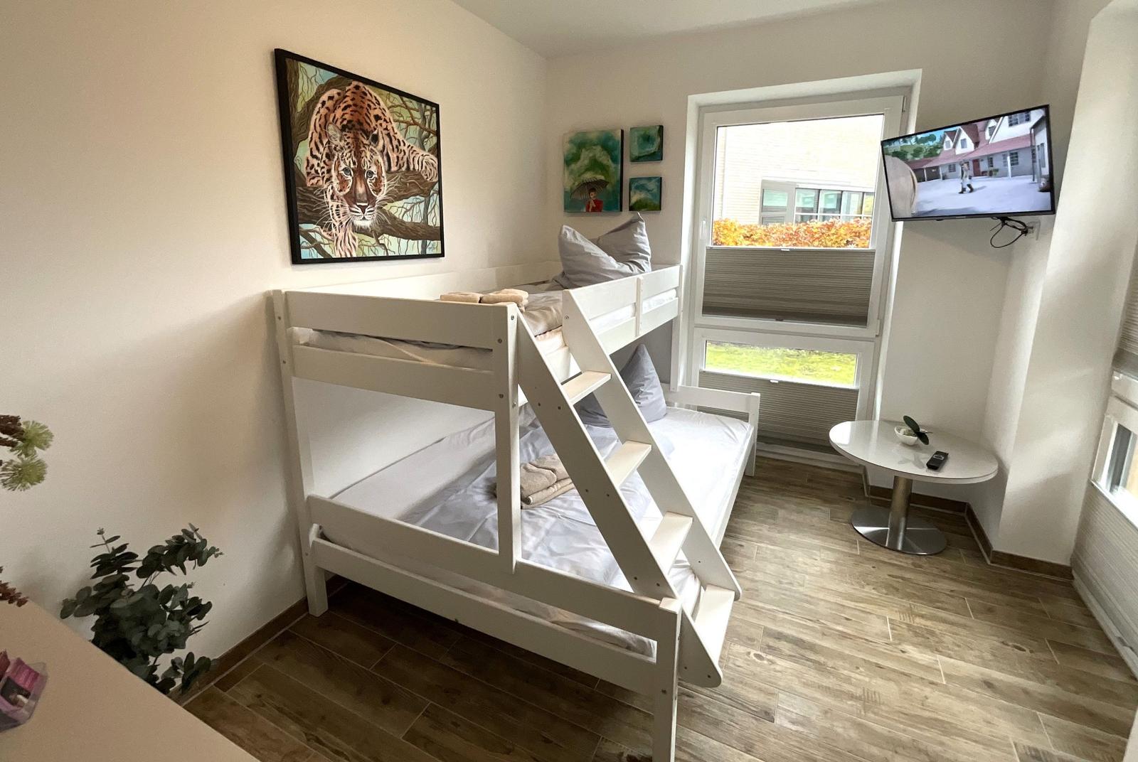 Die Ferienwohnung bietet eine ideale Rückzugsmöglichkeit für Erholungsuchende. Sie verfügt über ein gemütliches Schlafzimmer mit einem Doppelbett sowie ein Wohnschlafzimmer, in dem eine komfortable Schlafcouch bereitsteht. Das Badezimmer ist mit einer bodengleichen Dusche und einem Fenster ausgestattet, was für eine angenehme Belüftung sorgt. Die offene Küche ist modern und vollständig ausgestattet, inklusive Geschirrspüler, Backofen, Elektro-/Gasherd, Kühlschrank mit Gefriermöglichkeit, Mikrowelle und Kaffeemaschine. Für Familien ist ein Kinderhochstuhl vorhanden.