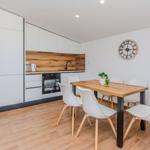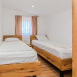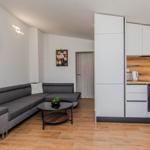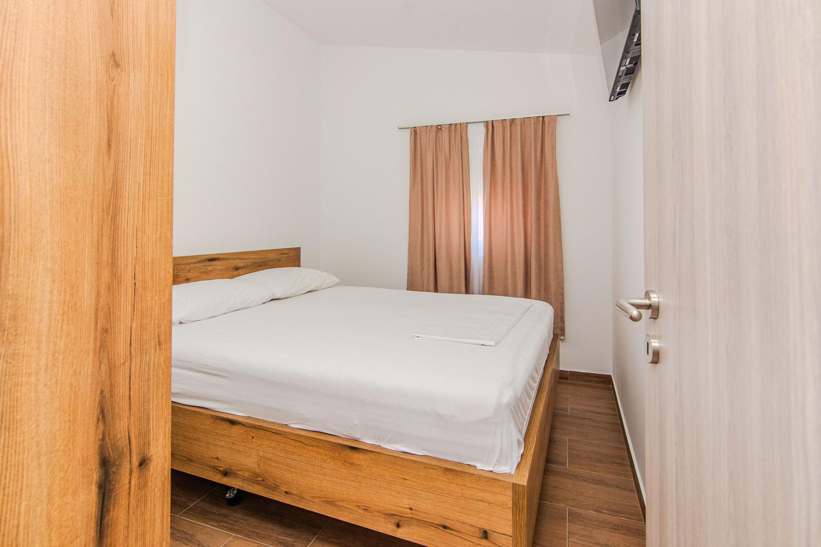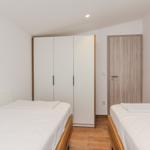 Das Apartment (60 m²) ist aufgeteilt in ein Wohnzimmer mit Essbereich, eine voll ausgestattete Küche, zwei Schlafzimmer, eines mit Doppelbett und SAT-TV und ein Schlafzimmer mit zwei Einzelbetten und ein Badezimmer mit Dusche. Zum Apartment gehört ein überdachter Balkon (6 m²) mit Tisch und Stühlen.