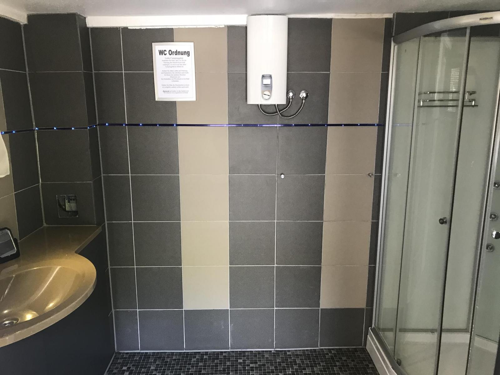 2 Toiletten und 1 Dusche stehen für den gesamten Platz ( Wohnwagen und Wohnmobile) kostenlos zur Verfügung.