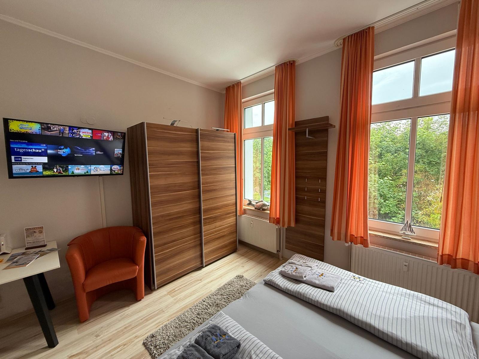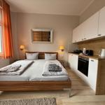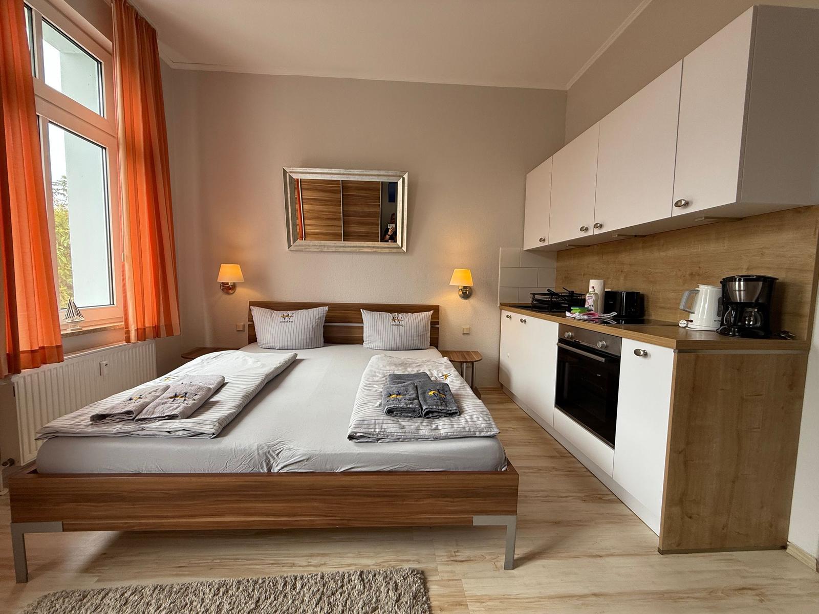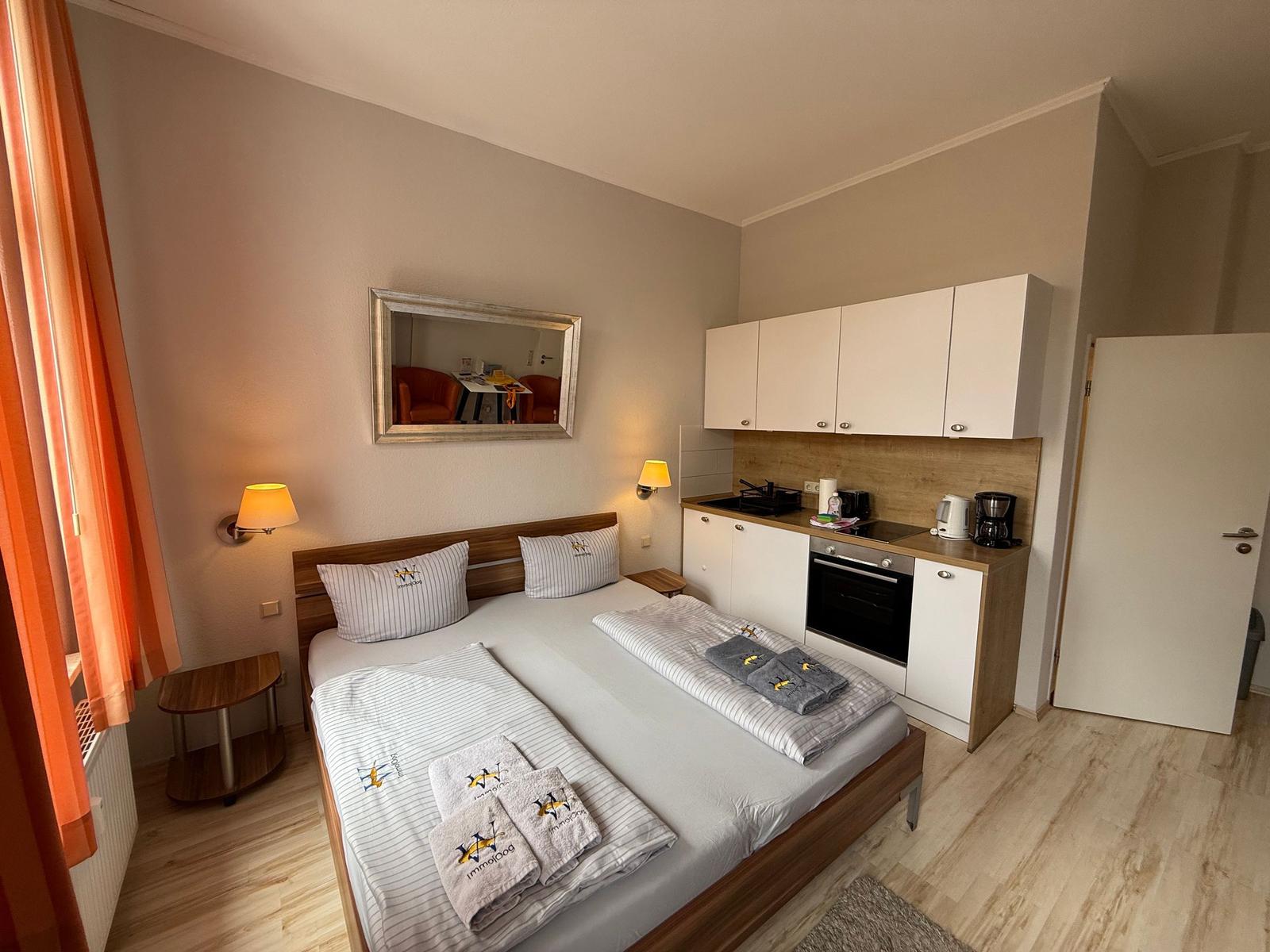 Das geräumige Wohnschlafzimmer lädt zum Verweilen ein und kann flexibel genutzt werden. Hier finden sich gemütliche Sitzmöglichkeiten sowie ein zusätzlicher Schlafbereich, der bei Bedarf genutzt werden kann. Die gesamte Wohnung ist hell und einladend, was eine behagliche Atmosphäre schafft.