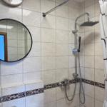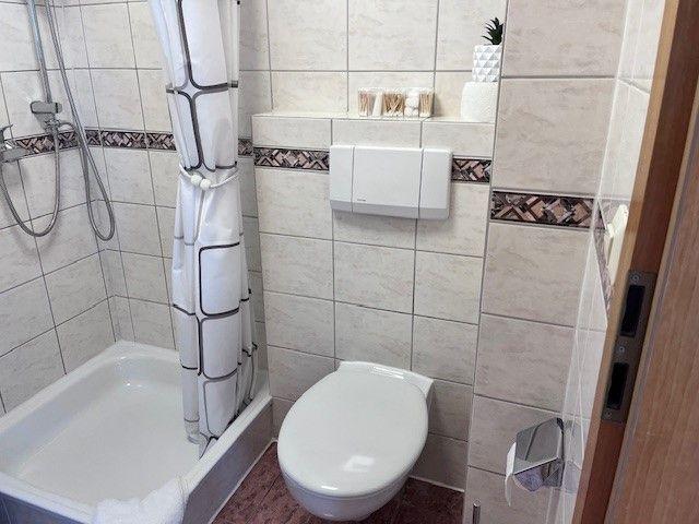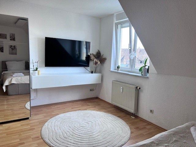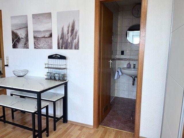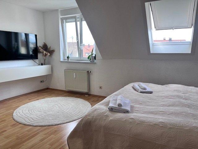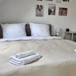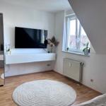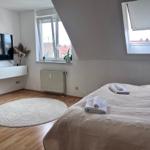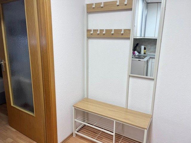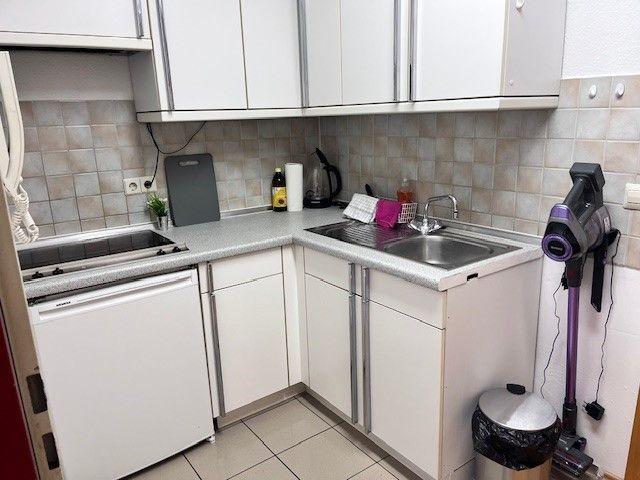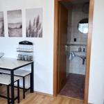 Durch den Flur und Küche gelangt man direkt in den Schlafbereich, der mit einem komfortablen Boxspringbett, einem Nachttisch sowie einem geräumigen Kleiderschrank ausgestattet ist. Eine integrierte Einbauküche sowie eine Garderobe sorgen für zusätzlichen Komfort. Im Essbereich stehen ein Tisch und zwei Stühle zur Verfügung, zudem gibt es einen kleinen Arbeitsplatz mit passendem Schreibtisch. Für Unterhaltung sorgt ein Smart-TV Flachbildschirm, 150 cm. Kaffee und Tee stehen den Gästen kostenlos zur Verfügung. Das moderne Badezimmer ist mit Dusche und WC ausgestattet. Die Bettwäsche und Handtücher sind für Ihren Aufenthalt inklusive.