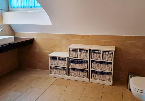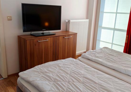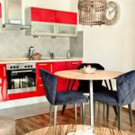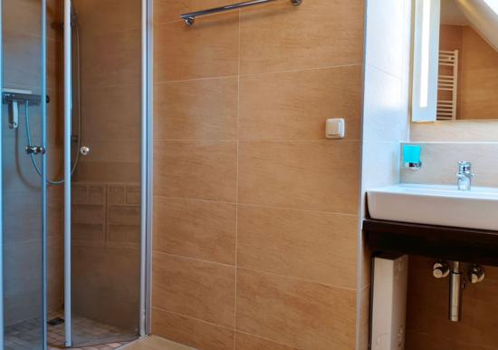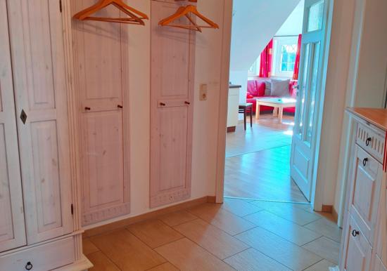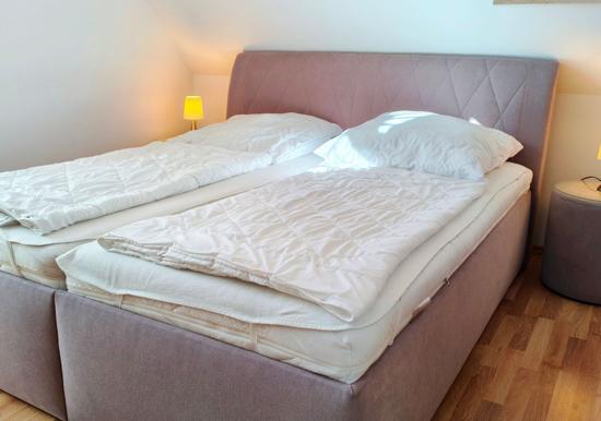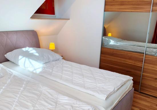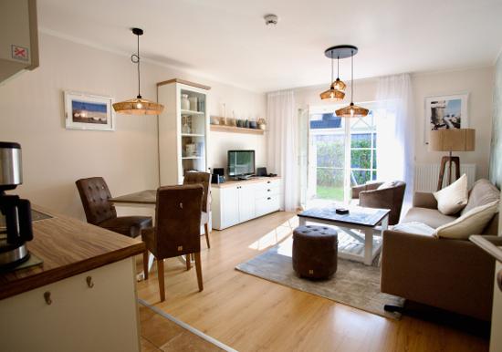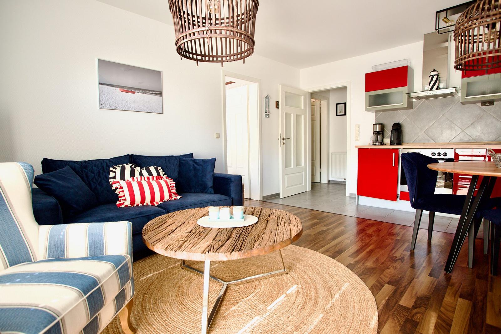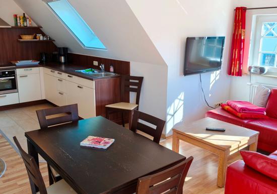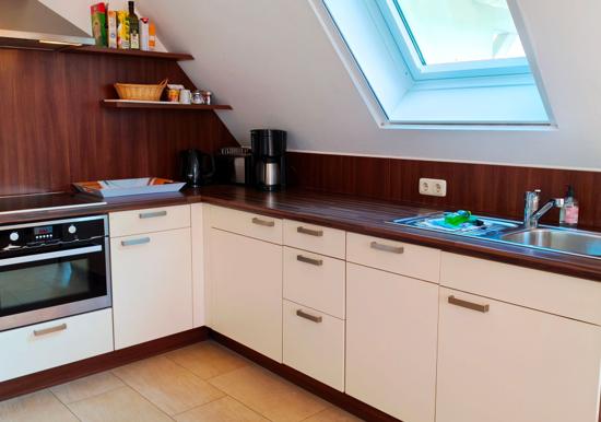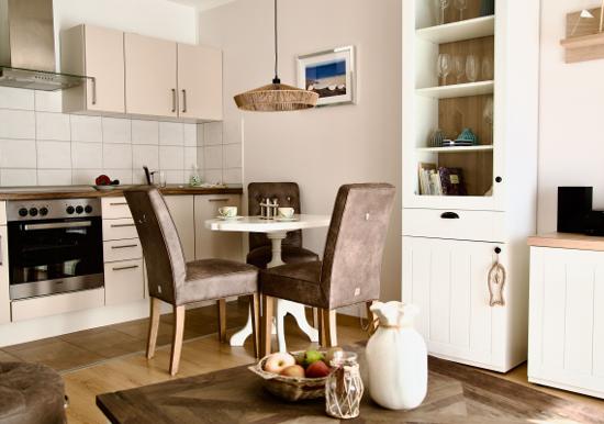 Die Ferienwohnung bietet eine ideale Rückzugsmöglichkeit für Erholungssuchende. Sie umfasst ein Schlafzimmer mit einem komfortablen Doppelbett und ein modernes Badezimmer mit Duschbad und Haartrockner. Die offene Küche ist komplett ausgestattet mit einem Elektro-/Gasherd, Backofen, Geschirrspüler, Kühlschrank, Gefriermöglichkeit, Kaffeemaschine, Toaster und Wasserkocher.