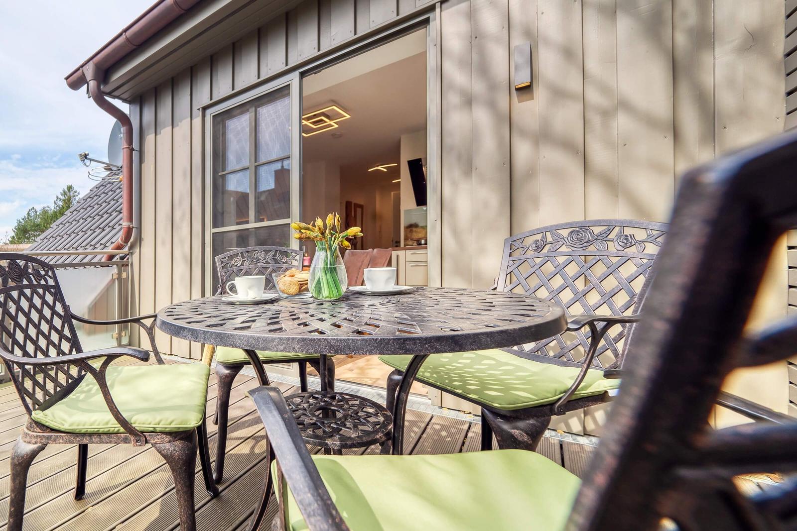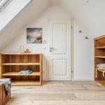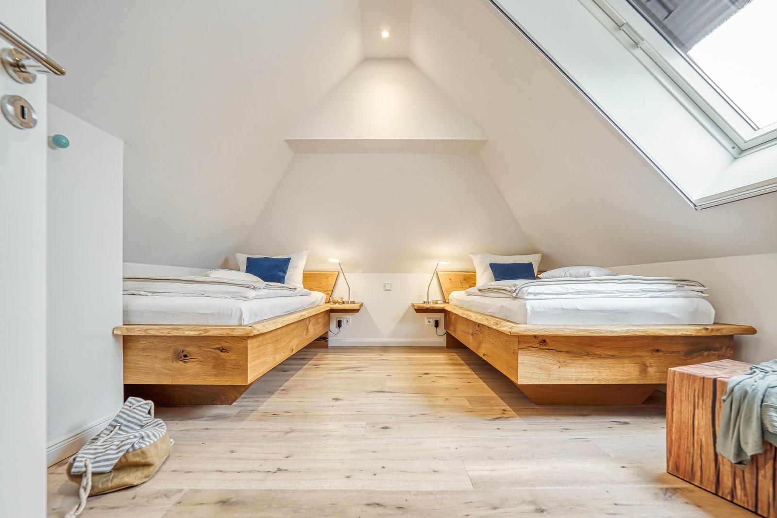 Die komfortable Raumaufteilung umfasst zwei Schlafzimmer, darunter ein Doppelbett und zwei Einzelbetten, ideal für Familien oder Gruppen. Das Badezimmer mit Fenster verfügt über eine bodengleiche Dusche und Fußbodenheizung, die zusätzlichen Komfort bietet.