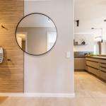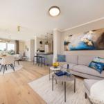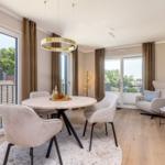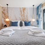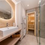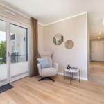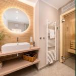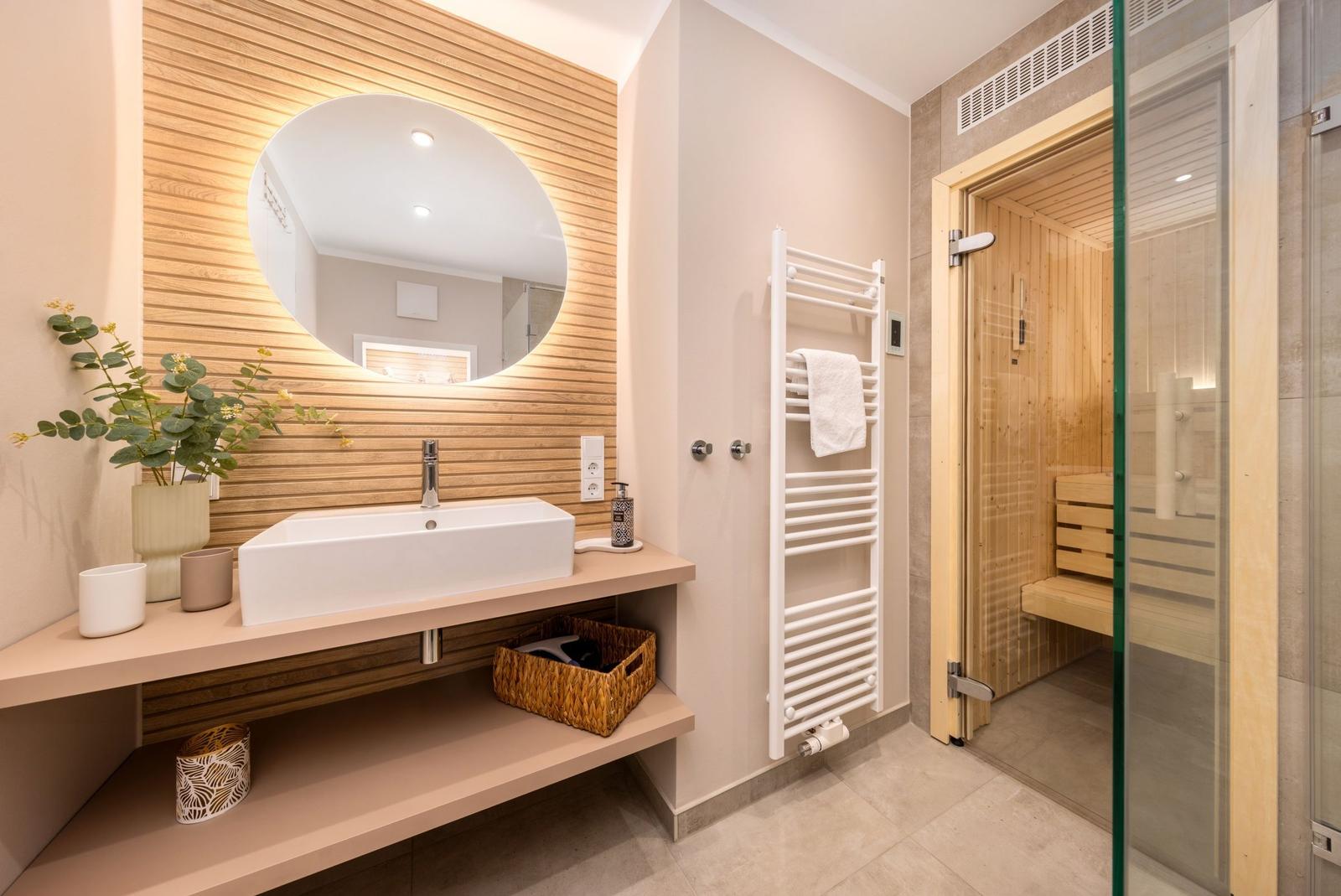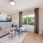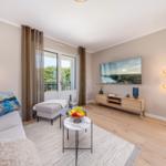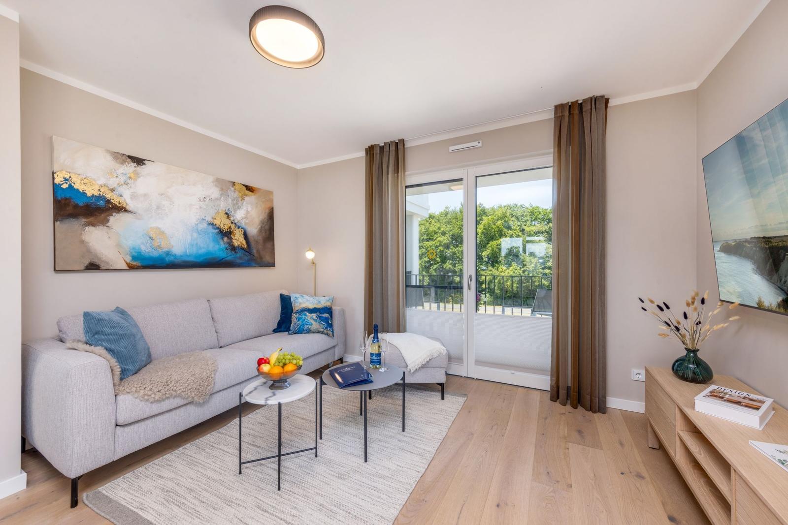 Das Apartment 14 der Strandvilla Zingst ist eine moderne und barrierefreie Unterkunft mit 65 Quadratmetern, ideal für 2 Personen. Es umfasst ein Schlafzimmer und ein gemütliches Wohnzimmer mit einem Schlafsofa sowie einem offenen Wohn- und Essbereich. Die voll ausgestattete Küche bietet sämtliche Annehmlichkeiten, darunter einen Induktionsherd, eine Spülmaschine und eine Kaffeemaschine. Das gepflegte Badezimmer verfügt über eine bodengleiche Dusche, einen Kosmetikspiegel, einen Haartrockner und eine Sauna zur Eigennutzung. Ein Kleiderschrank sowie ein Einbauschrank im Flur sorgen für ausreichend Stauraum. Für zusätzlichen Komfort stehen ein überdachter Balkon, ein Wäscheständer sowie ein Bügelbrett und Bügeleisen zur Verfügung. Ein Stellplatz in der Tiefgarage sowie ein Fahrradabstellraum mit Lademöglichkeiten für E-Bikes ergänzen die Ausstattung.
