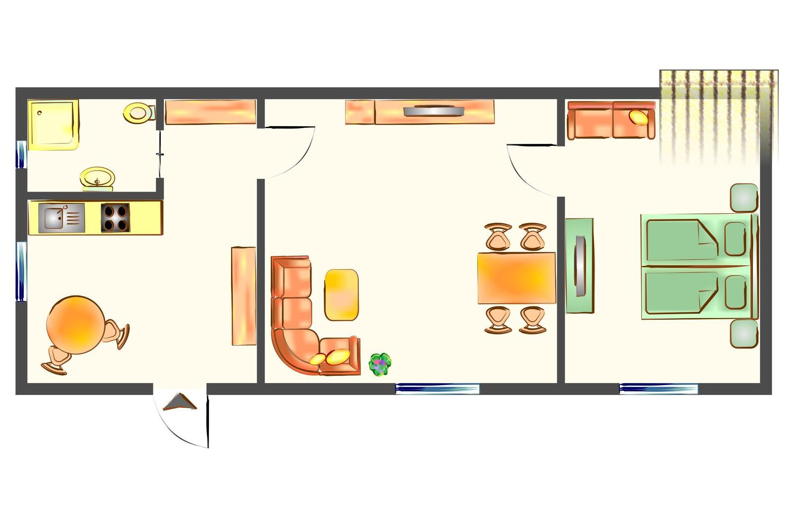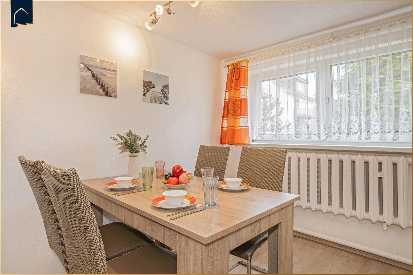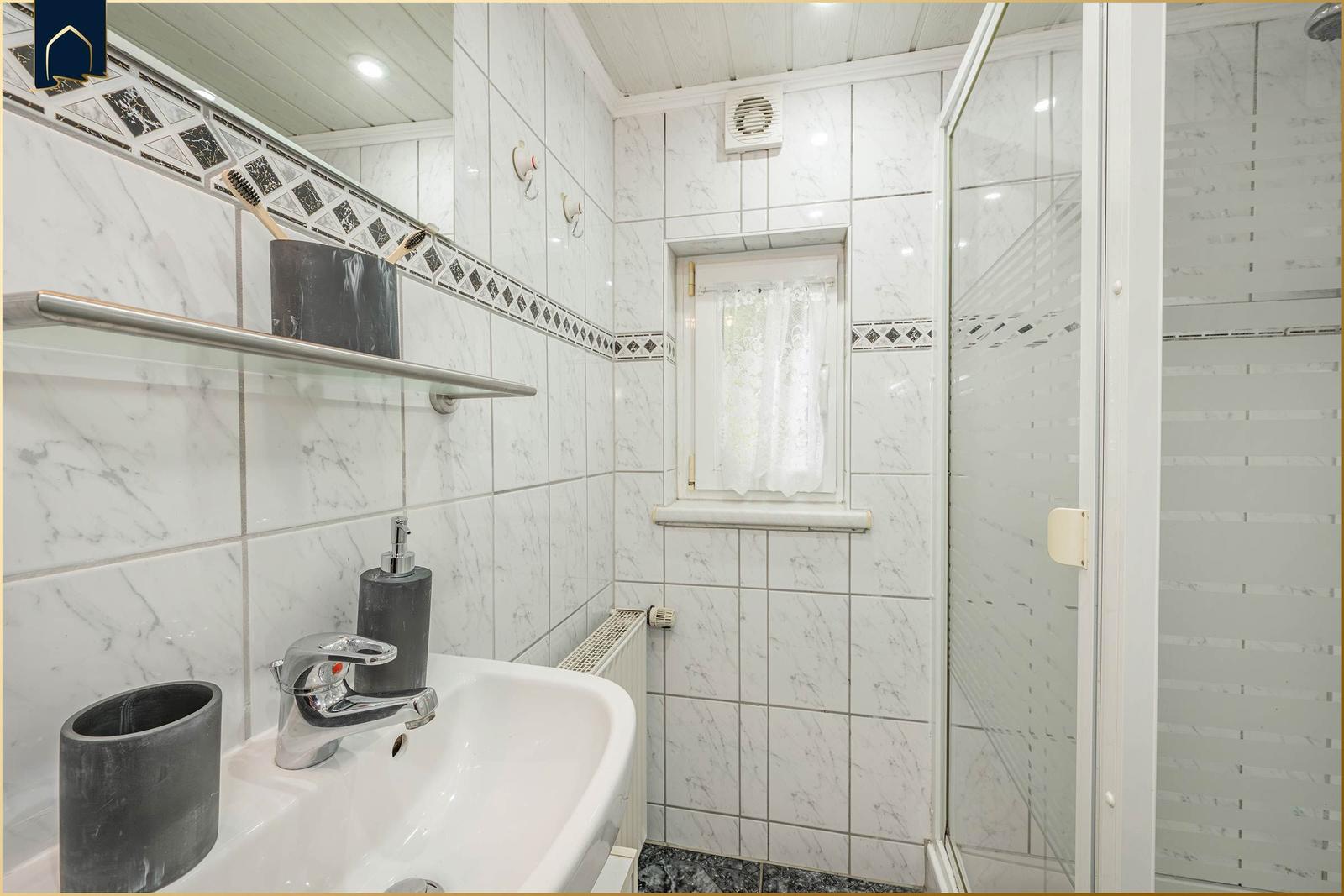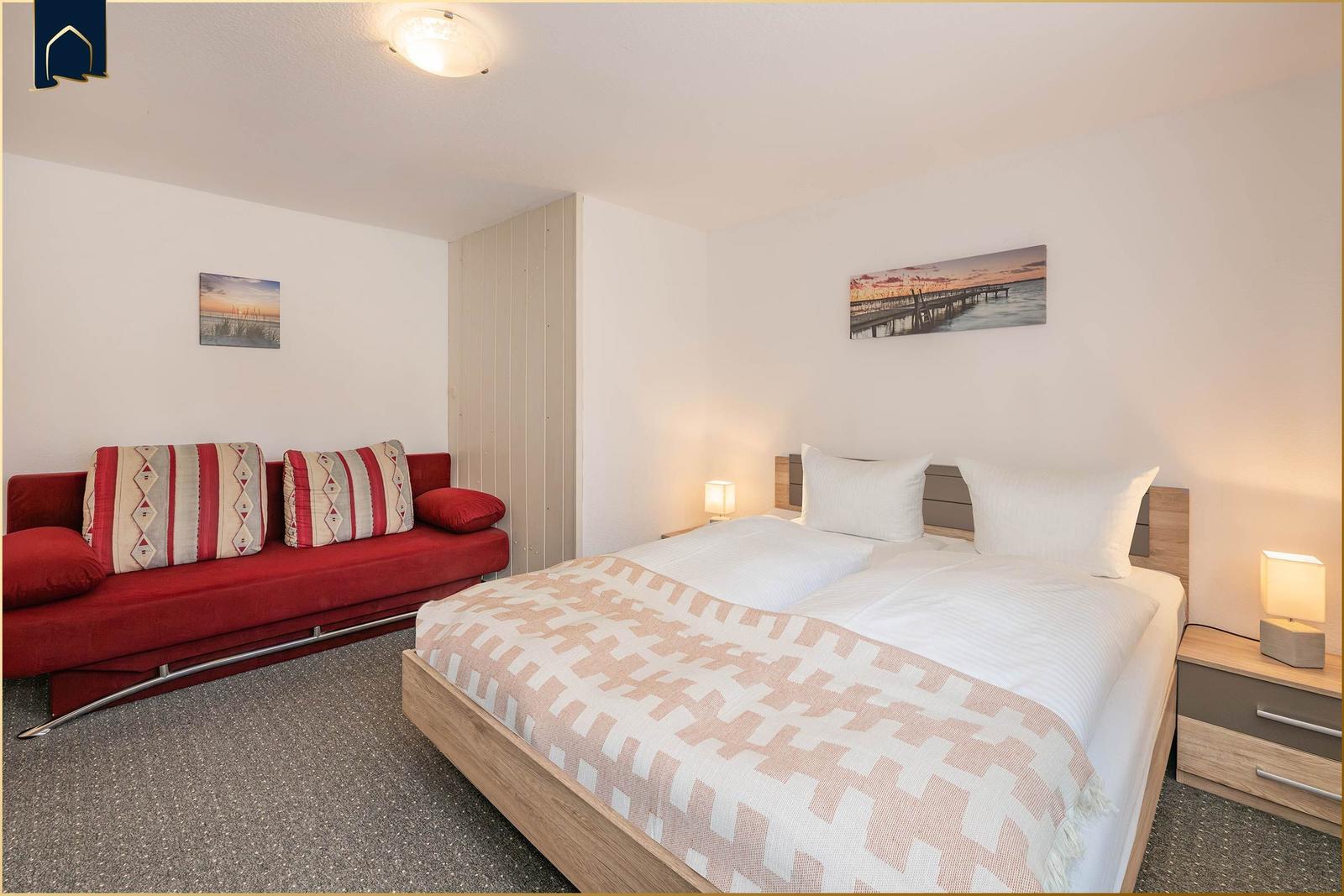 Diese geschmackvoll eingerichtete Ferienwohnung bietet eine ideale Rückzugsmöglichkeit für Urlauber. Sie umfasst ein gemütliches Schlafzimmer mit einem komfortablen Doppelbett und ein Badezimmer mit Fenster, das über eine moderne Duschbadewanne verfügt.